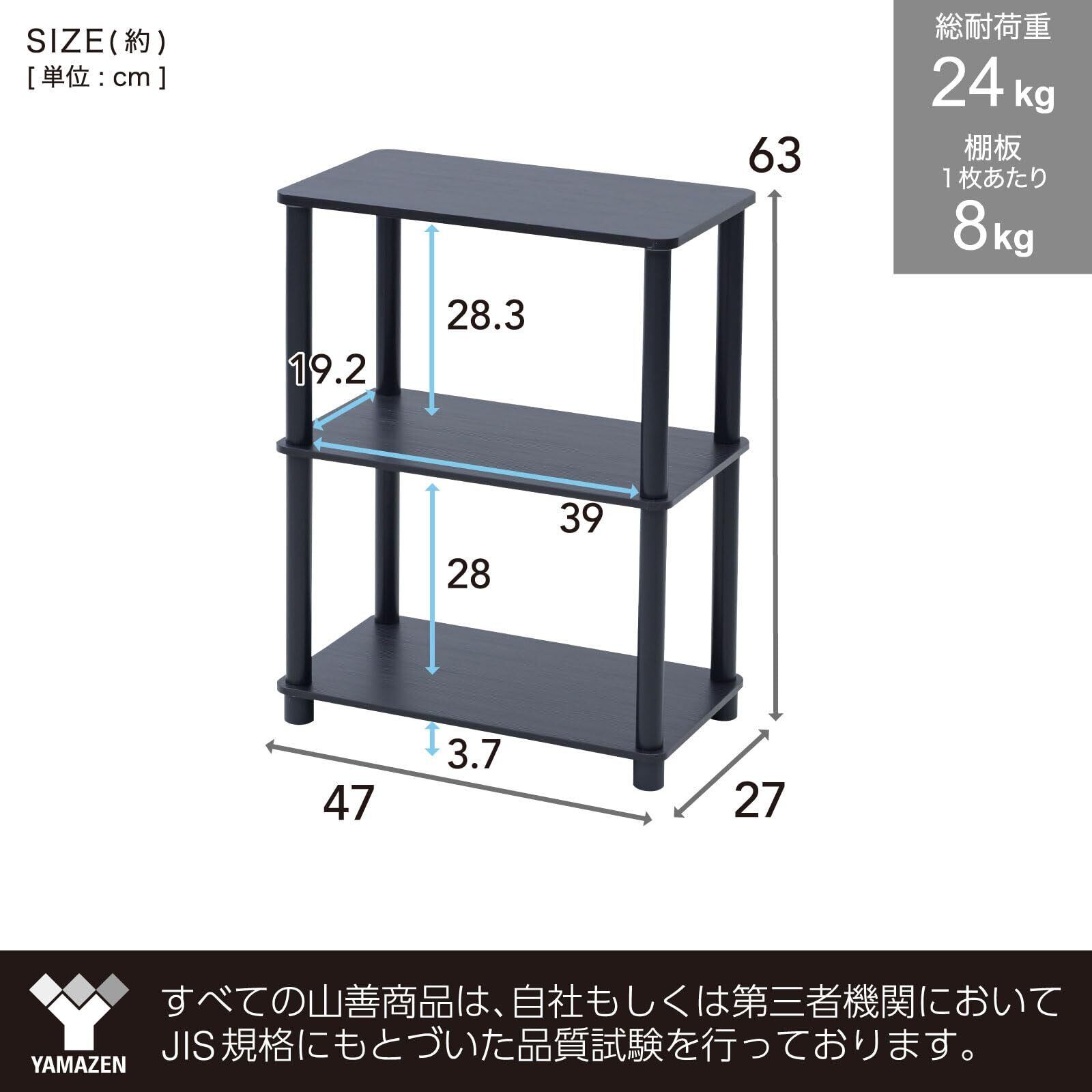 ●サイズ(約) : 幅47×奥行27×高さ63.5cm●収納内寸(ポール間) : 幅39×奥行19×高さ28cm●構造部材 : 支柱/ポリエチレン・ポリプロピレン●甲板の表面材 : プリント紙化粧パーティクルボード●耐荷重:全体 24kg(天板8kg、棚板1枚あたり 8kg)●東証プライム(株)山善で扱うすべての山善商品は、自社もしくは第三者機関において、JIS規格に基づいた品質試験を行っております。