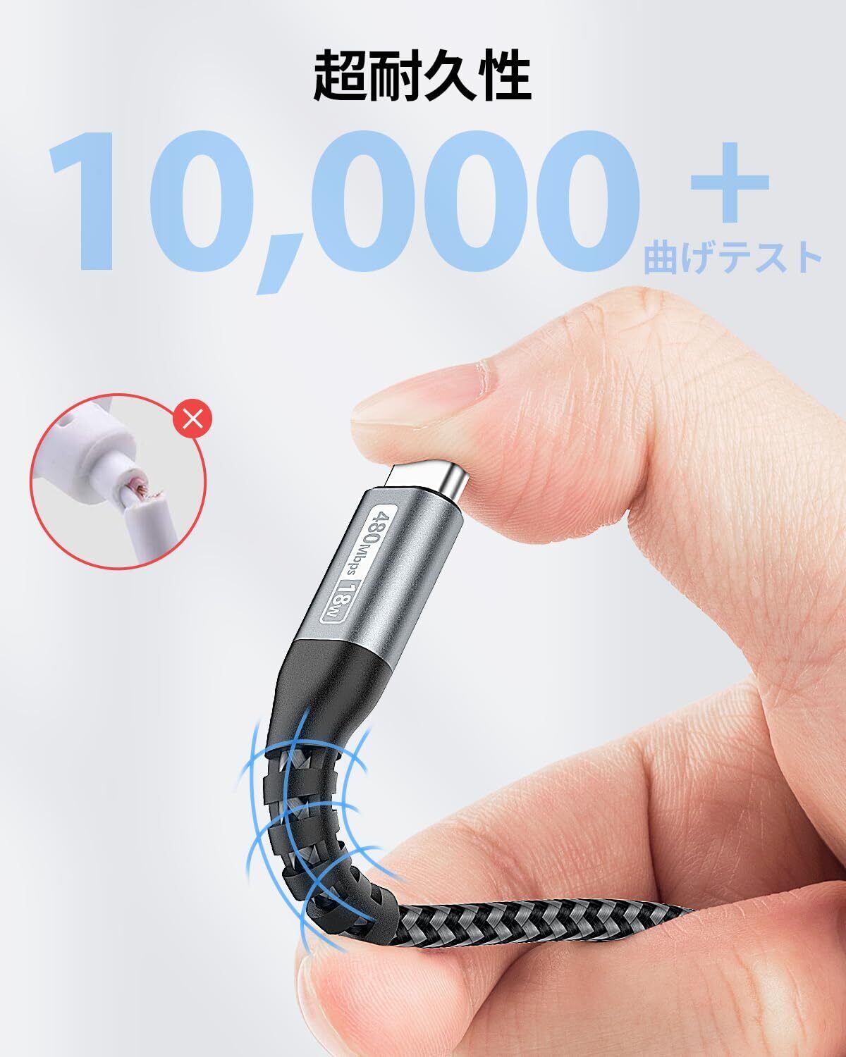 【高耐久性】弊社の充電ケーブル type-cは高耐久のナイロン編みを採用しており、柔軟性と耐久性両方備えます。弾力を備えたタイプCの充電ケーブルであり、10,000回以上の折り曲げに耐えうるまでに圧倒的な持続力を持ちます。極めて高い耐久性を確保しています。