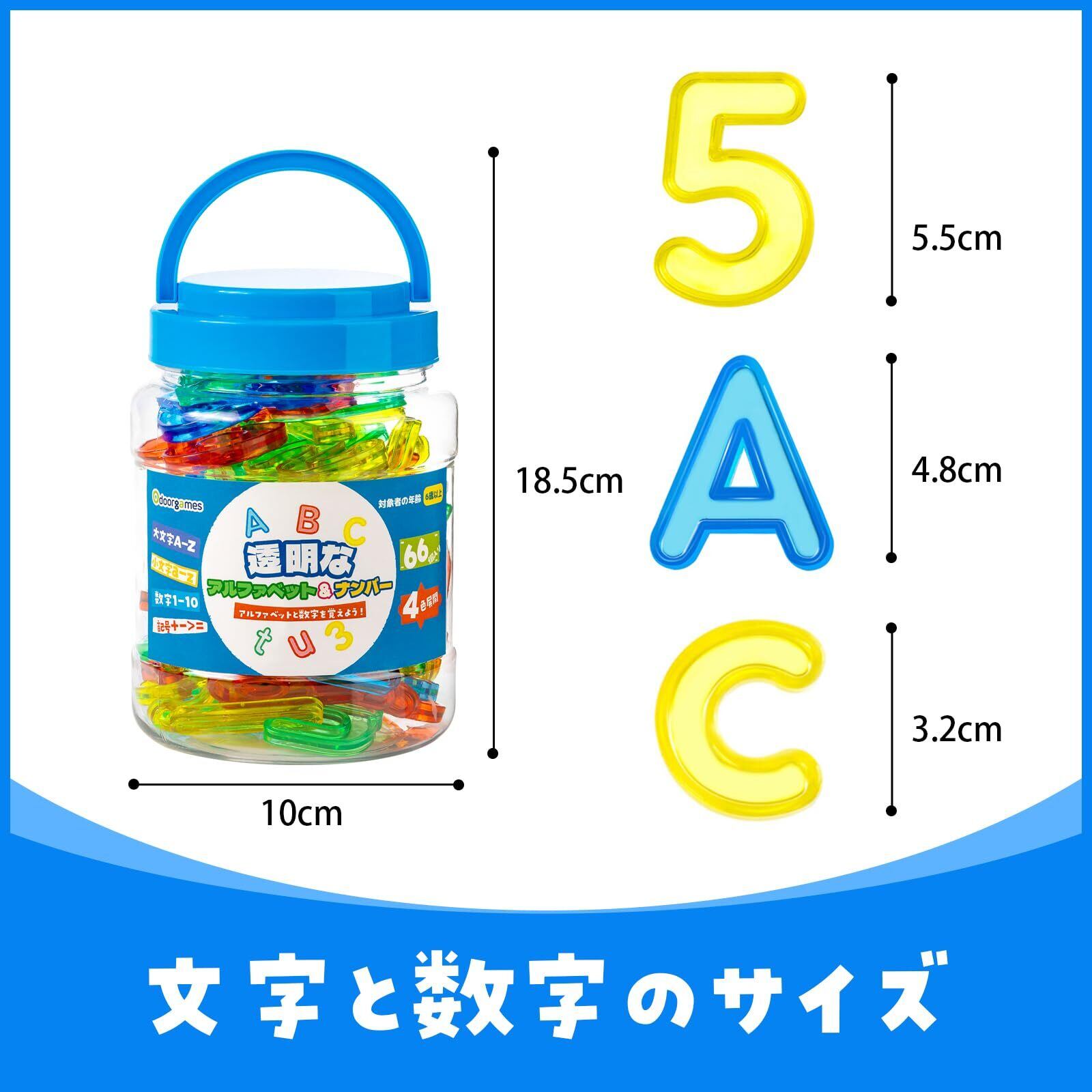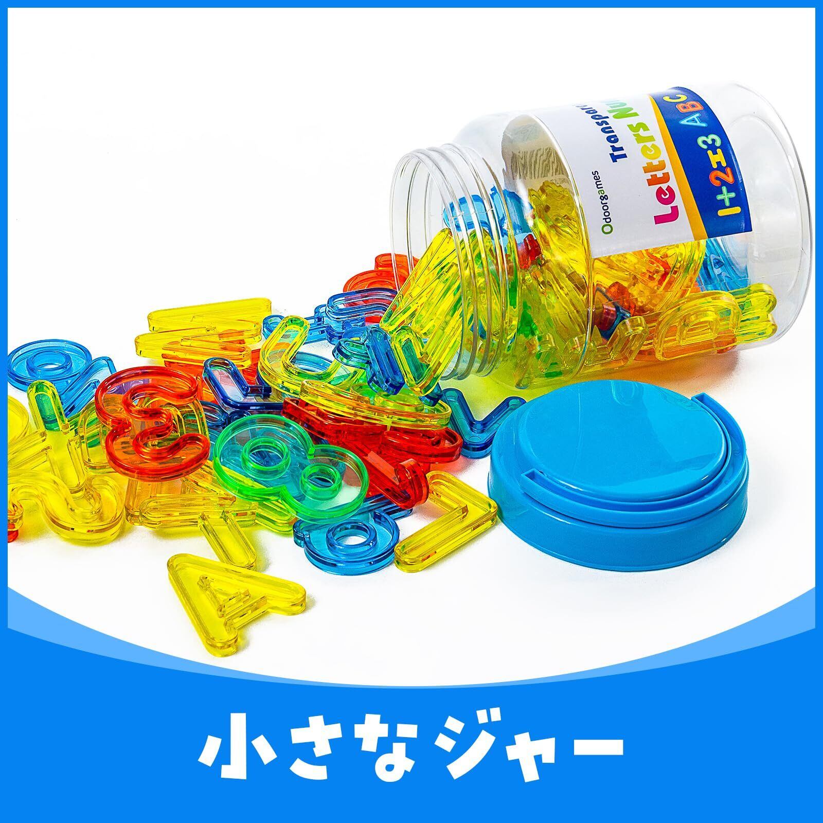 スペリングとカウントの楽しさ: 66個のカラフルな半透明のおもちゃが入ったこのミニジャーには、数字、大文字、小文字が、すべて美しい半透明の青、緑、赤、黄色で入っています。