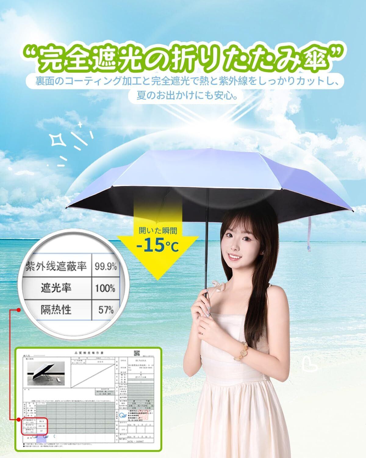 【UVカット遮光率100 折りたたみ日傘】高密度傘生地と黒ゴムの完璧な組み合わせ、優れた品質、UPF+50、UVカット率99%以上、完全遮光100%、遮熱効果付き。 特に夏場は、熱中症予防にもなります。 日差しが強くなくても、紫外線は強いので、この傘で美肌をしっかり守ってくださいね