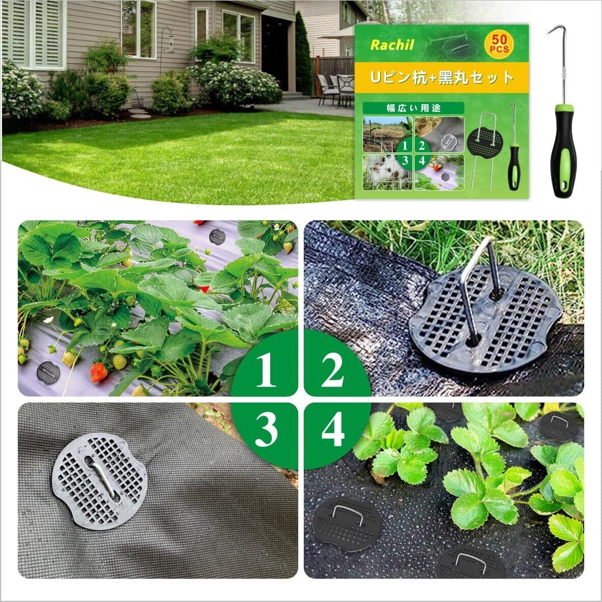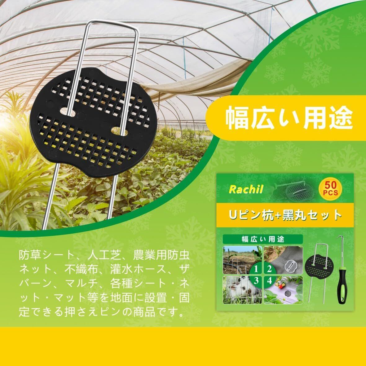 【幅広い用途】防草シート、人工芝、農業用防虫ネット、不織布、灌水ホース、マルチ、各種シート・ネット・マット等を地面に設置・固定できる押さえピンの商品です。