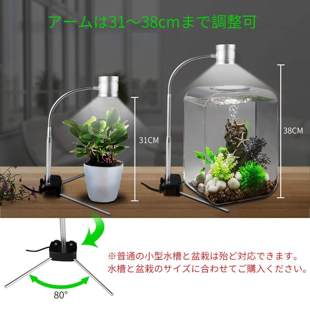 スタンドの角度は85°、アームの長さは31から38cmまで調整でき、そのうちソフトアームの長さは12CMです。※普通の小型水槽と盆栽は殆ど対応できます。水槽と盆栽のサイズに合わせてご購入ください。