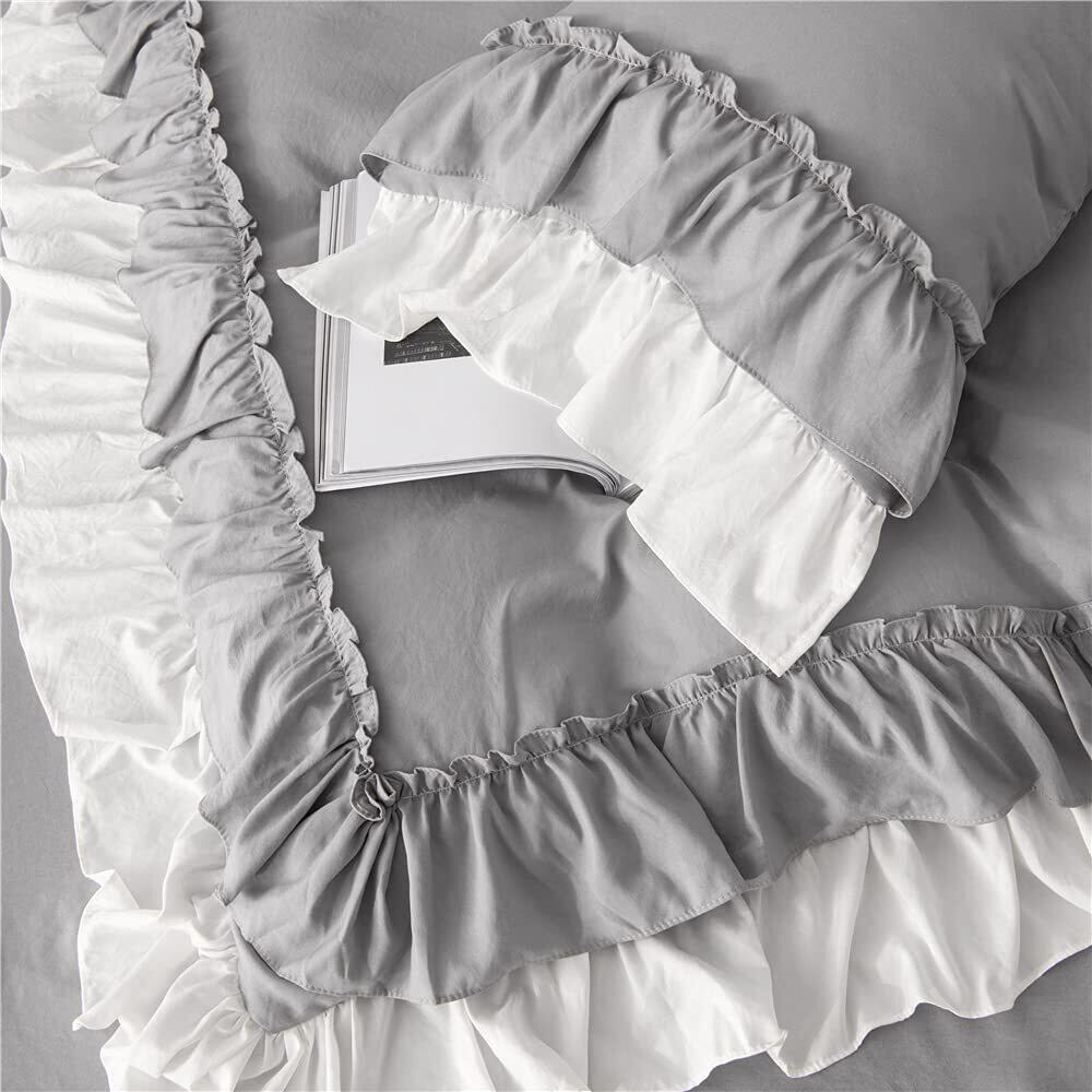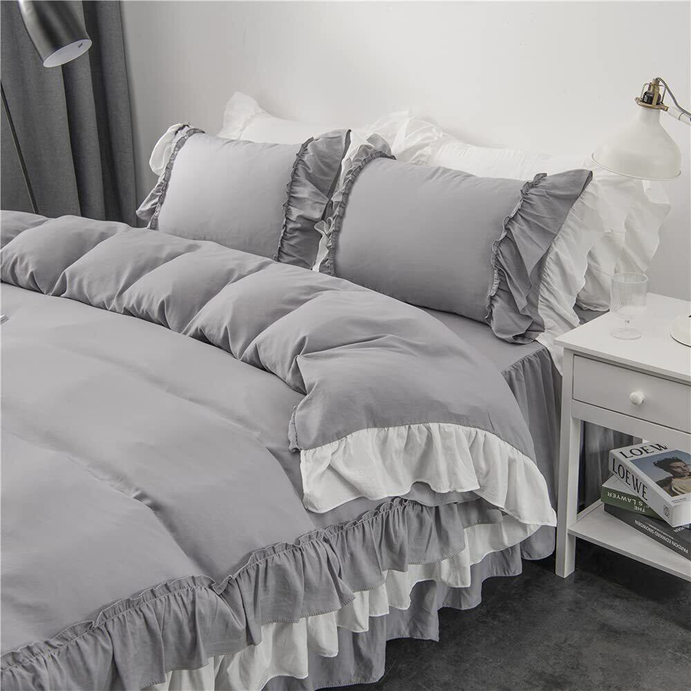 Ovege 布団カバー シングル 3点セット 掛け布団カバー ベッドスカート 洋式 枕カバー かわいい フリル付き おしゃれ ベッド用 布団用 ベット 寝具カバー 姫系 ピーチスキン加工 北欧 安心 抗菌防臭 洗い替え速乾 (グレー・フリル, シングル・3点セット)