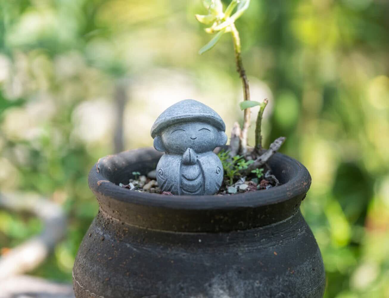 【店主からのメッセージ】:店主は京都の寺院を訪れた際、可愛らしい小さな僧侶や地蔵菩薩の石像を発見し、面白く美しい意味を感じました。帰宅後、名工の彫刻模型を探し、砂岩合成技術を使用して美しい小さな飾りを制作しました,白御影石で作られた手のひらにのせられる小柄なお地蔵さんです。