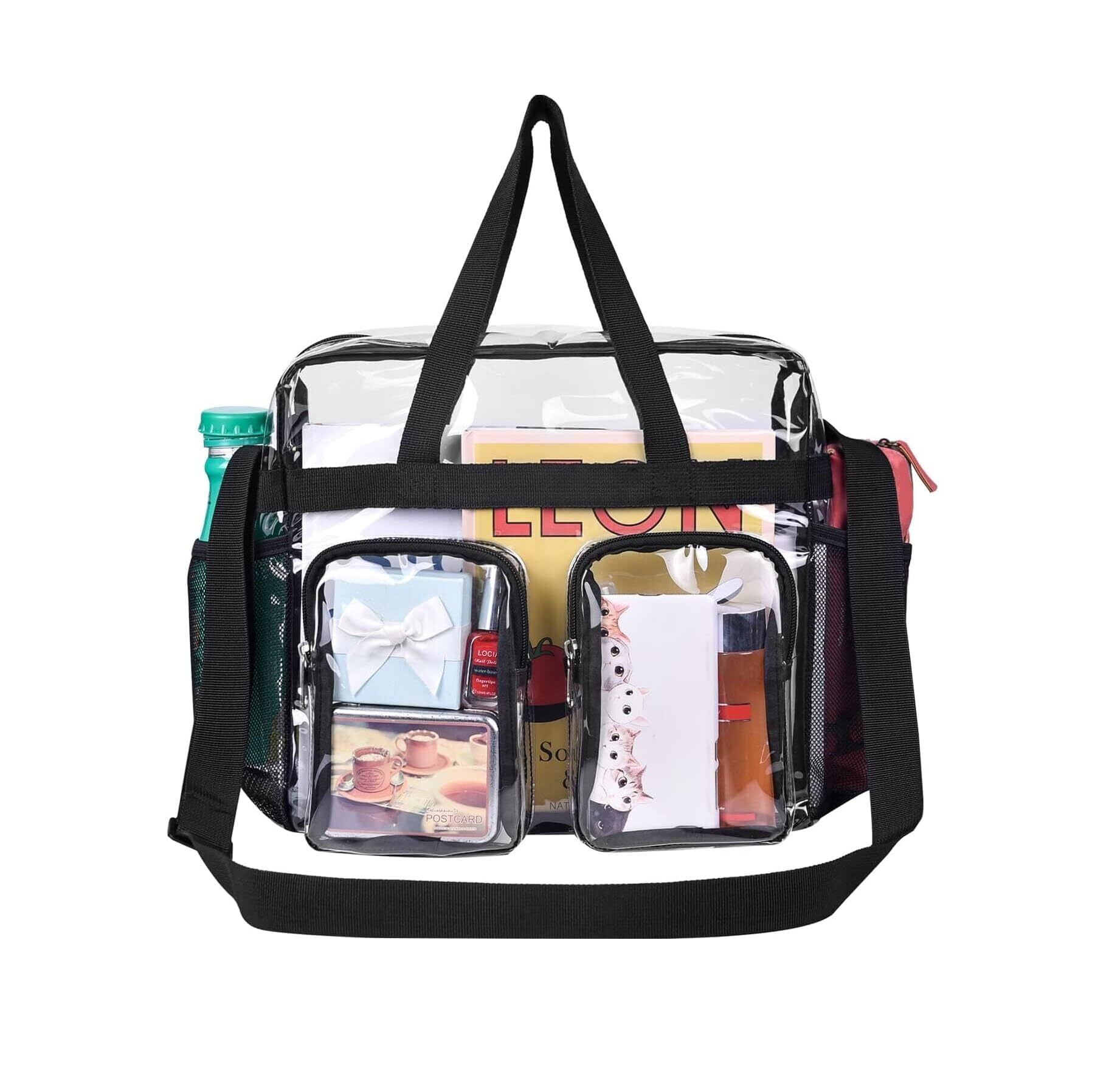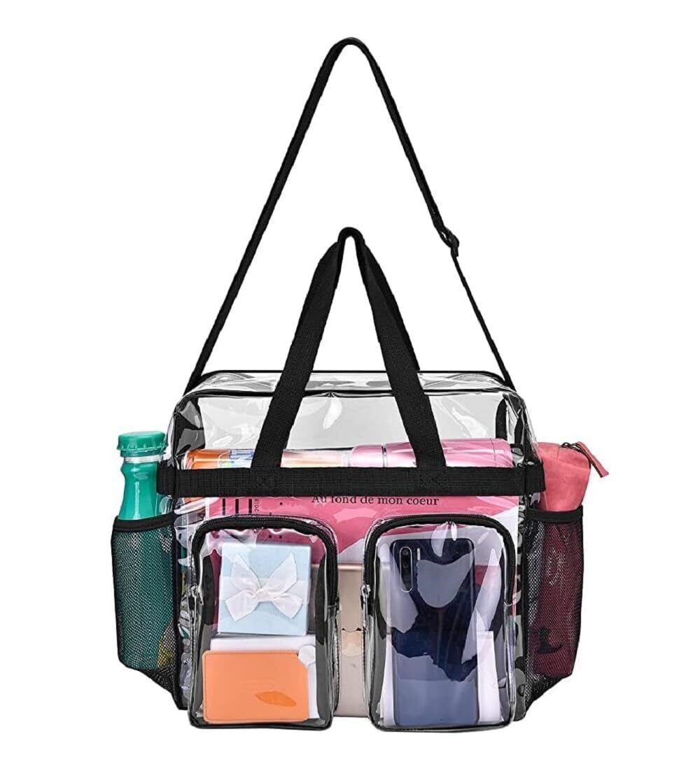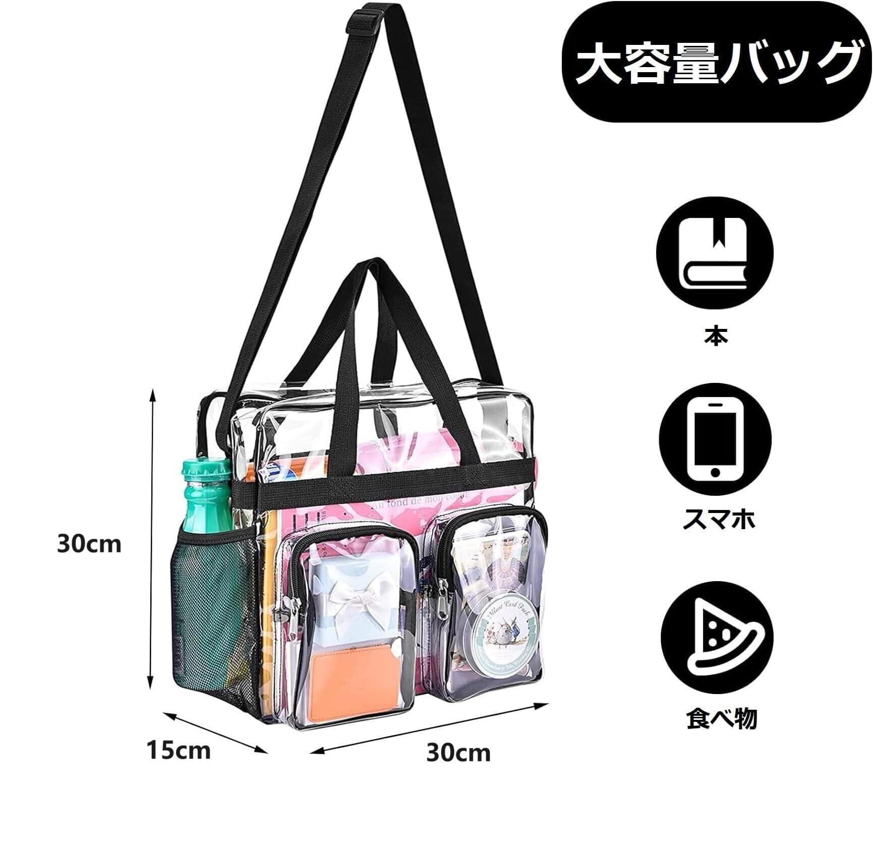 【優れた実用性】:シンプルな見た目ながらデザイン性を失わないバッグ、透明なボディで中身が一目瞭然なので、欲しいものがすぐに見つかります。バッグの側面には小さなポケットが複数あり、さまざまな収納ニーズに対応します。小さなジッパー付きPVCポケットには携帯電話や鍵などの貴重品を収納でき、メッシュポケットには傘や飲み物を収納できます。