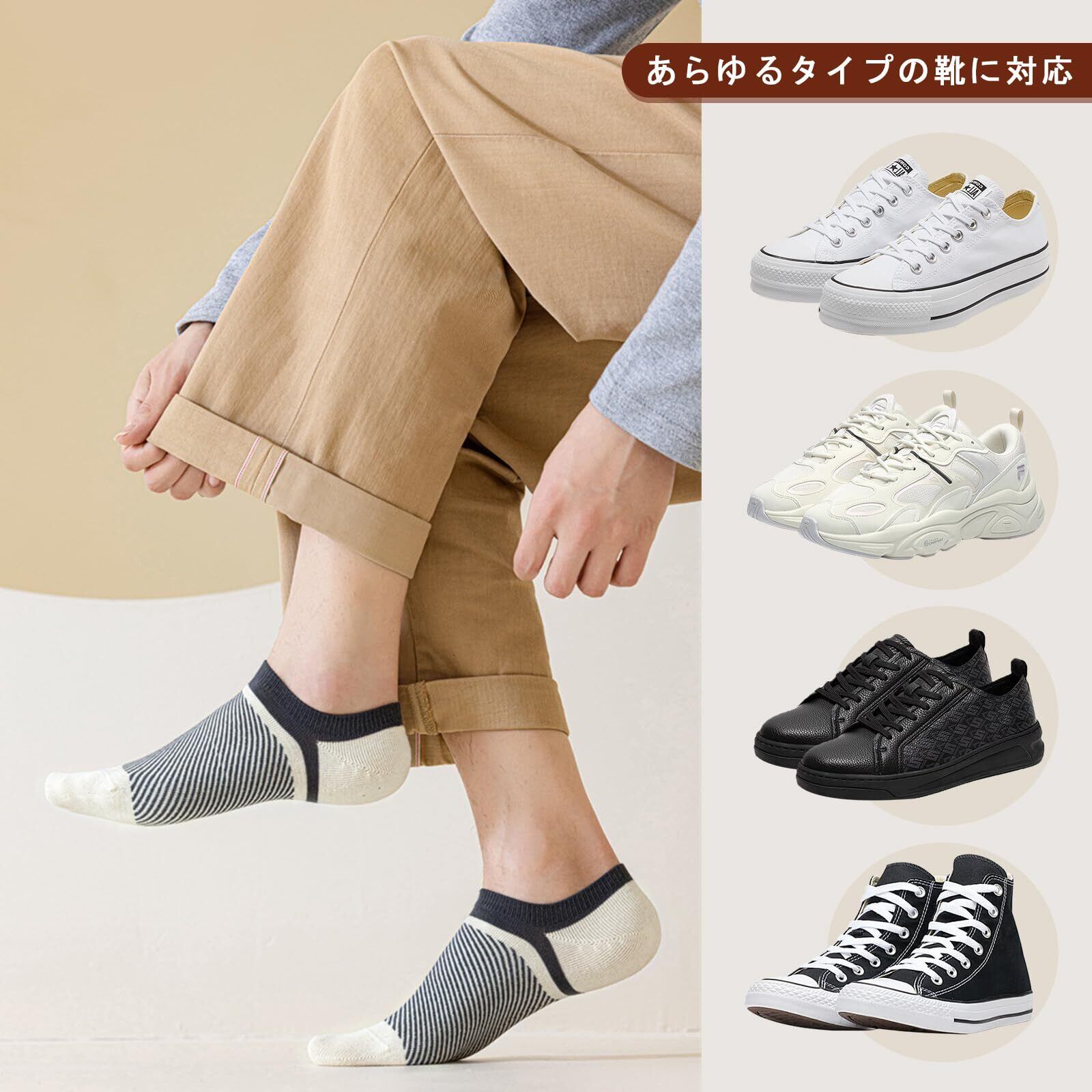 【綿混素材&快適さ】:メイン素材:80%綿 サイズ情報:約24-27cm 〇〇肌に負担や刺激の少なく、吸湿性や通気性もよい綿混素材を採用したメンズくるぶしソックスで、臭いや汗を気にせず、春夏でも蒸れずに快適で爽やかな履き心地になります。