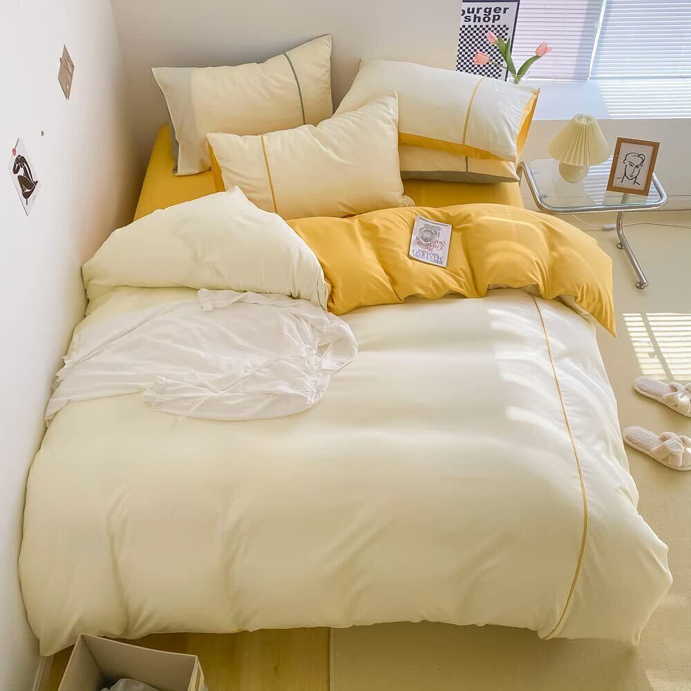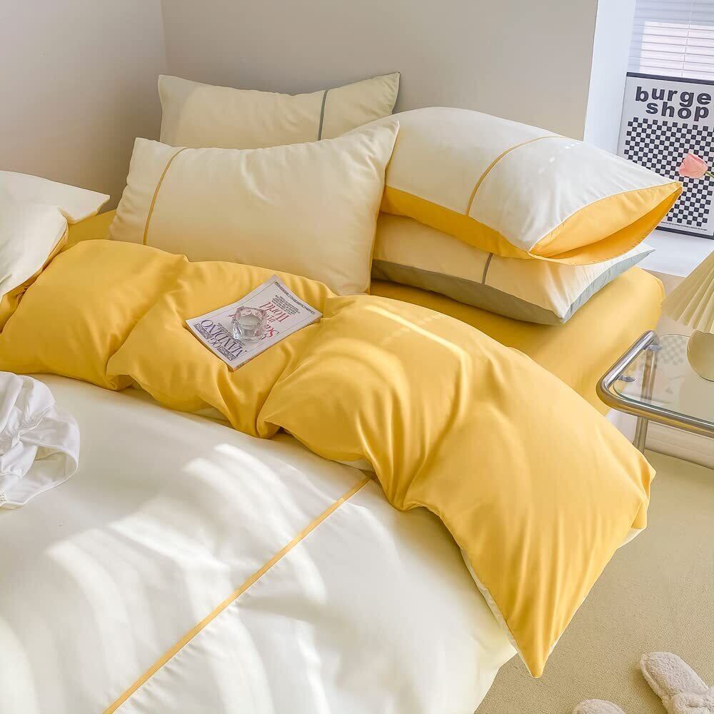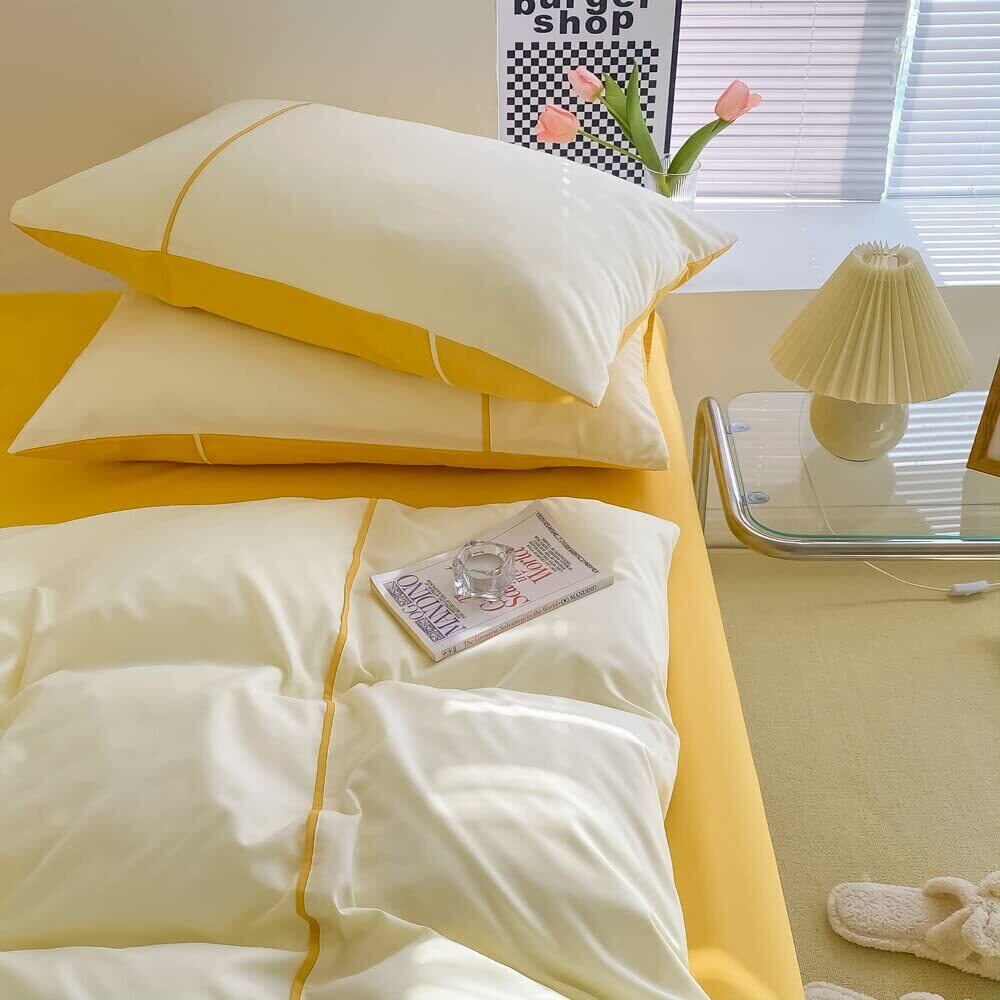 Ovege 布団カバー 3点セット シングル 掛け布団カバー ボックスシーツ 枕カバー 洋式・和式兼用 2方向ジッパー 100%マイクロファイバー ピーチスキン加工 洗い替え速乾タイプ (イェロー-クリーム, シングル・3点セット)