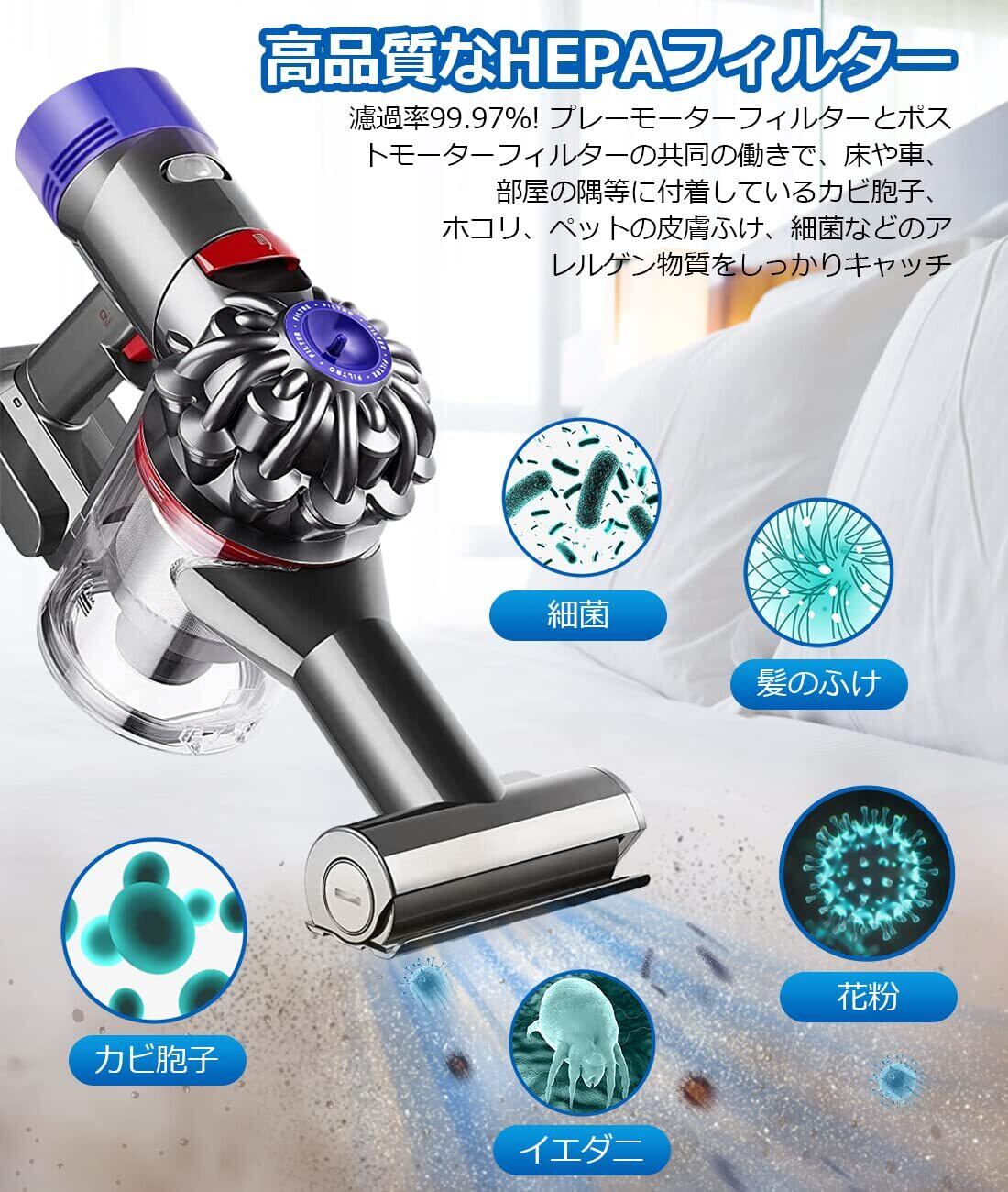 【プレモーターフィルター】高品質の静電気綿の材料を採用し、フィルターの濾過率が99.2%。空気中の細かいホコリや花粉や有害微生物をしっかりキャッチでき、掃除機のモーターも守ってくれる。