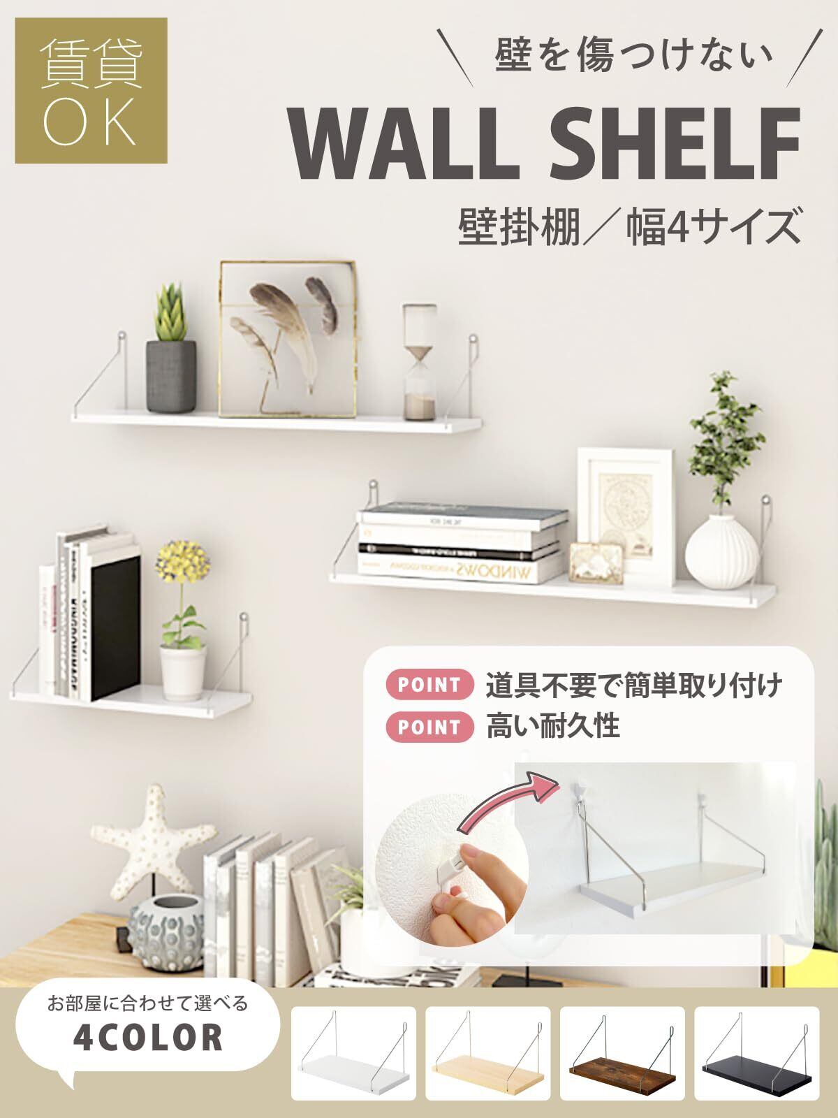 【賃貸OK&簡単取り付け】当店オリジナルのピンフックを使用することで、ウォールシェルフを壁に”ほぼ無傷”で取り付け可能。賃貸物件も◎ また、ドライバーなどの工具も必要なく簡単に取り付けできます。 ※取り付け方法は付属のピンフック、ネジからお選びいただけます。