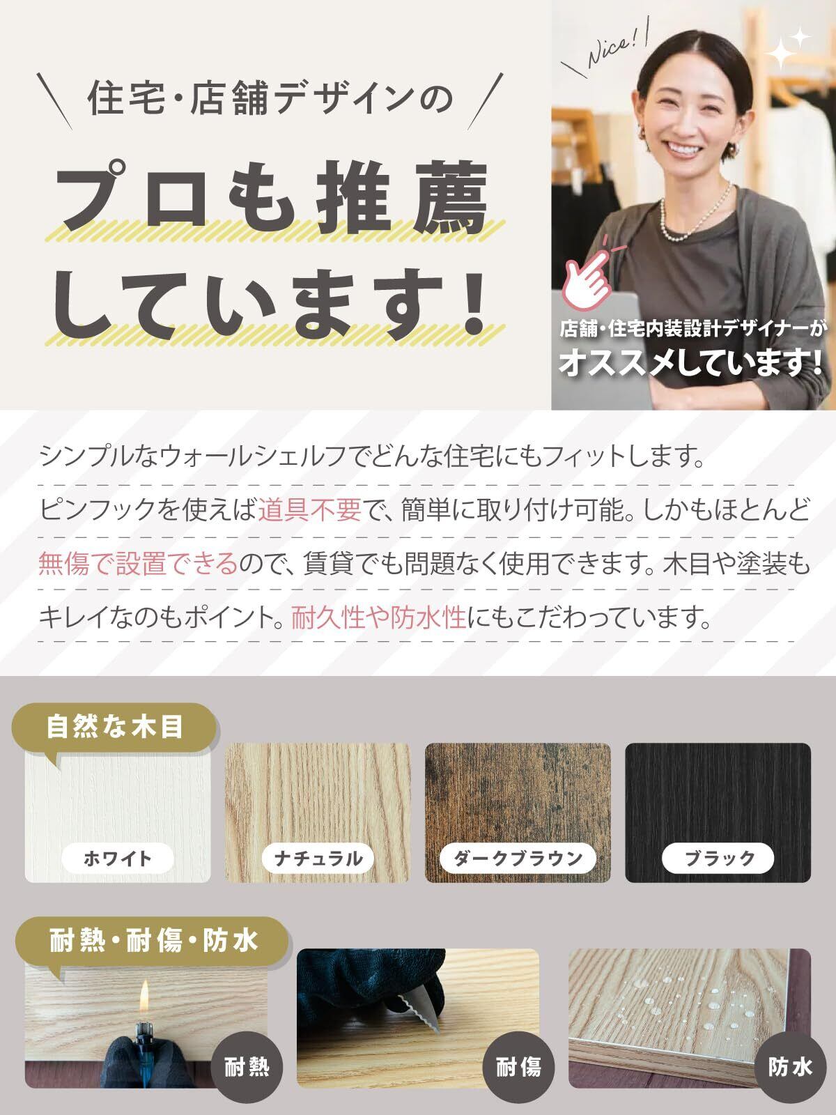 【高品質の棚板&フレーム】材質にもこだわり、耐久性・耐水性・耐傷性に優れた、長くご愛用頂けるシェルフです。 また、自然な木目(ホワイト、ナチュラル、ダークブラウン、ブラック)木目がお部屋に彩りをプラス。 フレームは左右対称に作られており、棚を正面から見たときにバランス良く、美しく見えます。