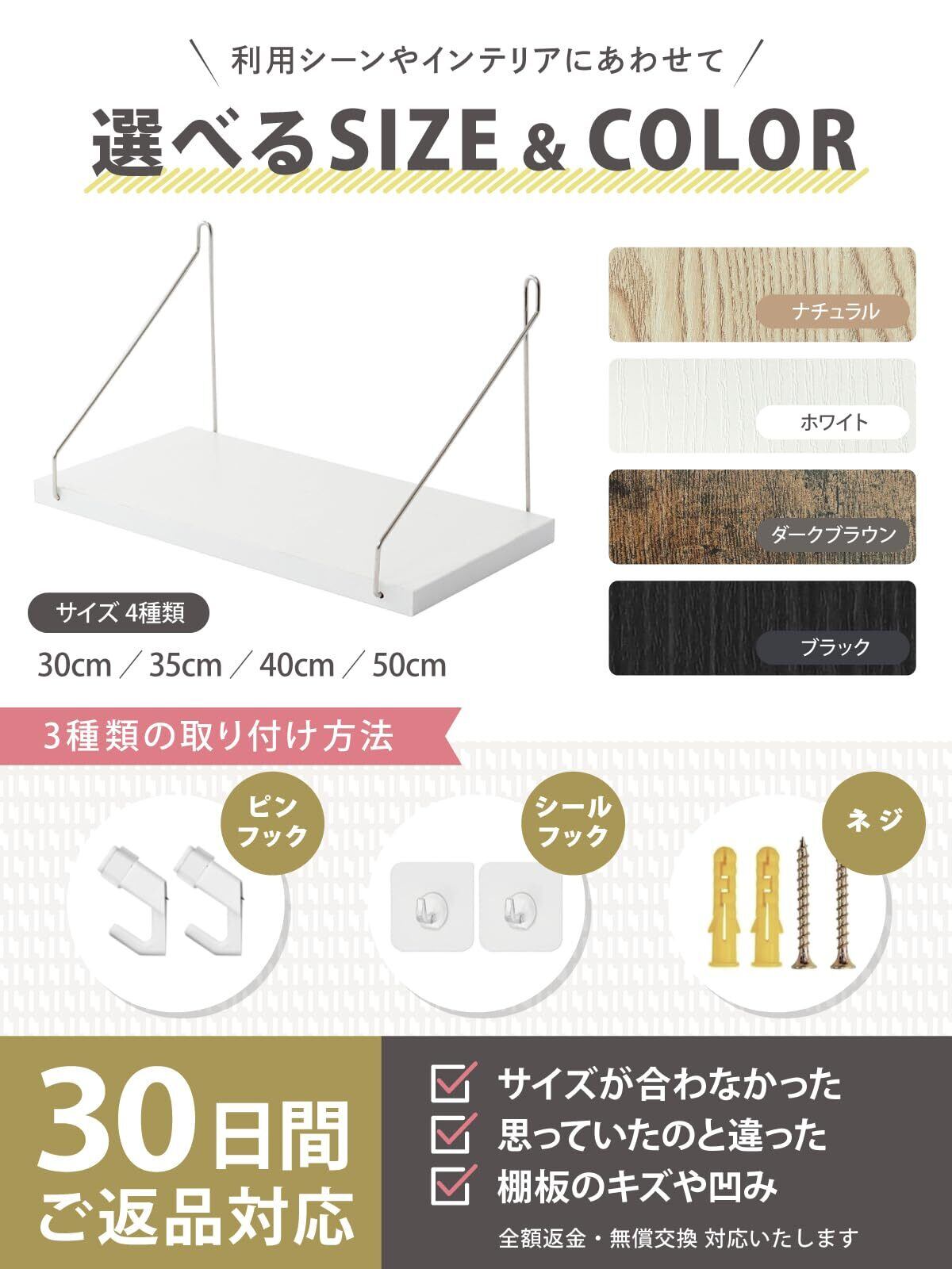 【商品仕様】■サイズ:幅30cm or 35cm or 40cm or 50cm×奥行15cm×高さ15cm ■カラー:ホワイト/ナチュラル/ダークブラウン/ブラック ■セット内容:ウォールシェルフ本体×1、取付け用ネジ×2、石膏ボード用アンカー×2、ピンフック×2、日本語取扱説明書 ■材質:木材 ステンレス ■耐荷重:3-10kg