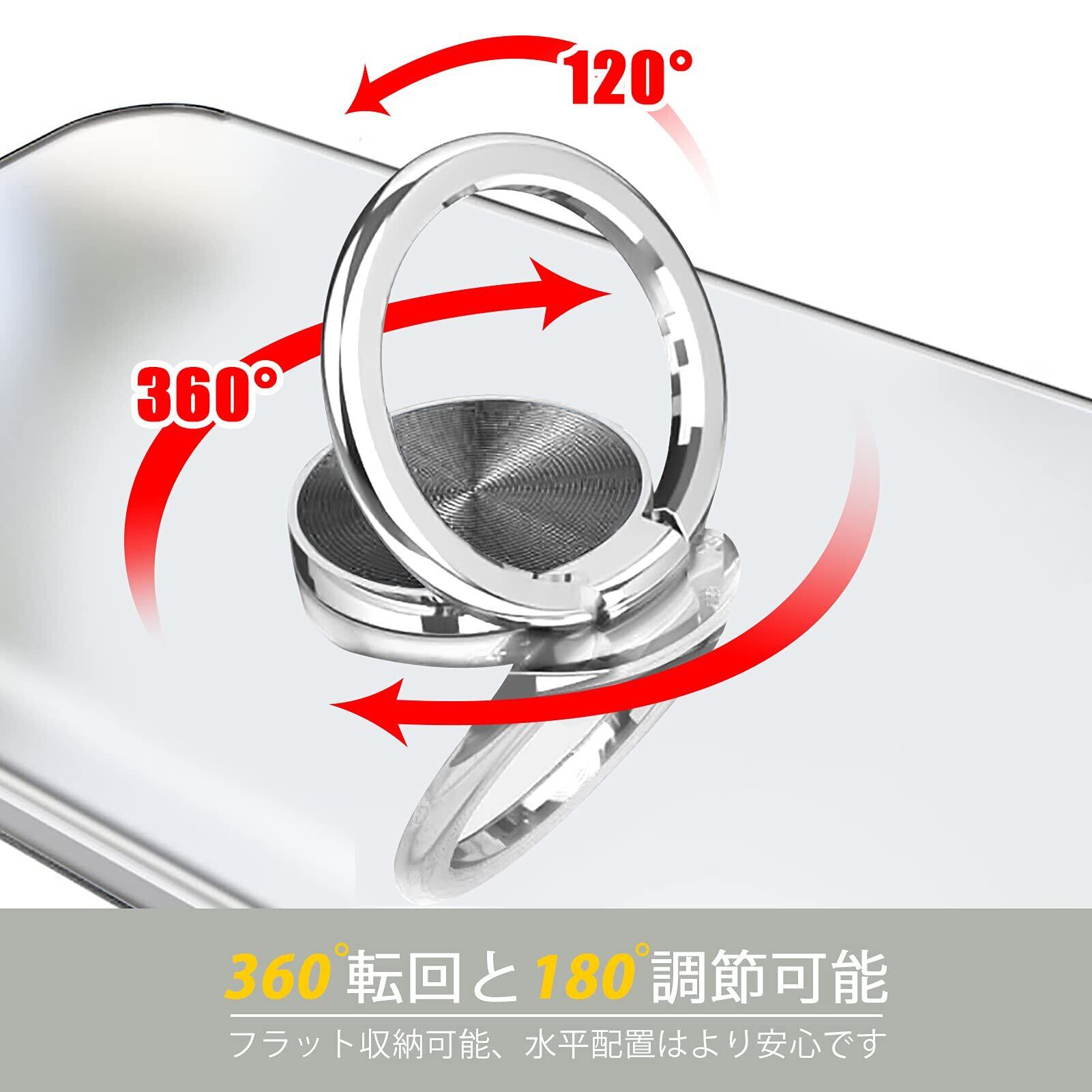 【機能性】後ろに付いているフィンガーリングはスタンド機能はもちろん、滑りにくくて持ちやすい、安定的なグリップが特徴です。リングはケースにしっかり固定されていて、縦置き、横置きどんな角度でも固定できます。360度回転可能、180角度調節可能。
