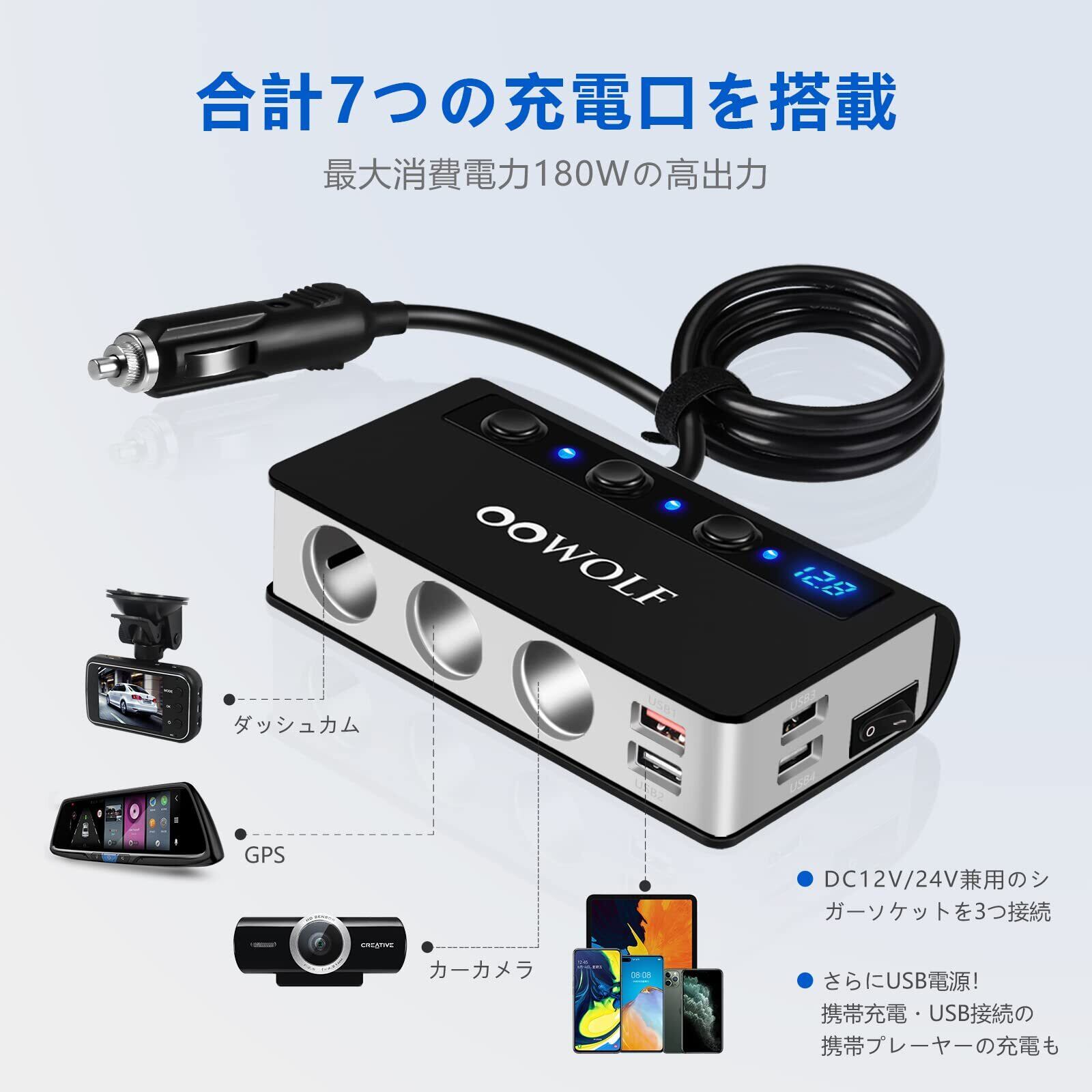 OOWOLF シガーソケット 3連 4ポート付き USB充電器 最大180W スマートIC 急速充電 増設 カーチャージャー 【Quick Charge 3.0 搭載】 12-24V車対応 独立スイッチ シガーライター機能搭載 1mケーブル 電圧測定 電源ソケット 分配器 取り替えヒューズ2個付属