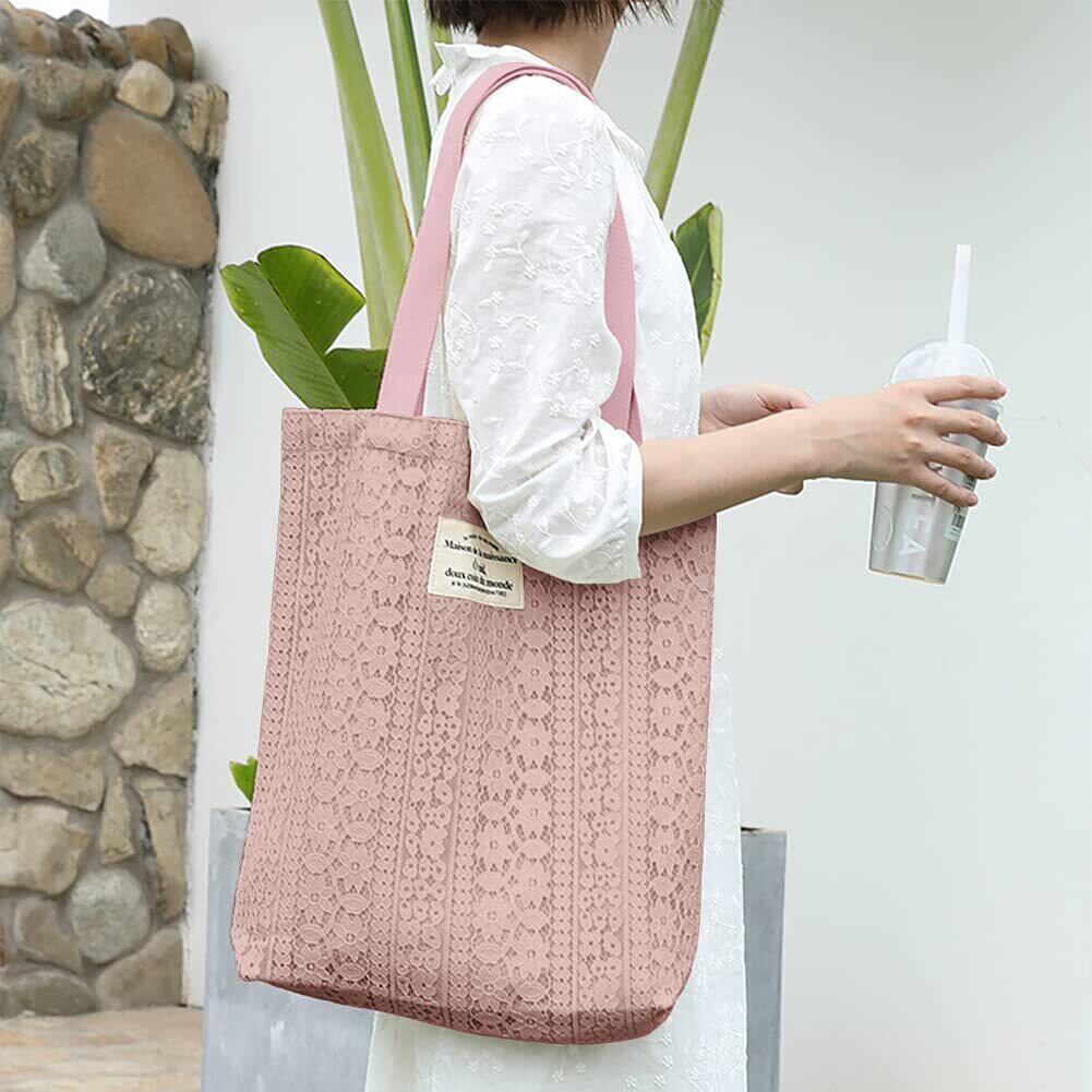 [Sueeya] (スイーヤ) トート バッグ レディース レース キャンバス ショルダー 2way 肩掛け 可愛い シンプル 軽量 おしゃれ シート 裏地付き 収納可能 ポケット ファッション 通勤 通学