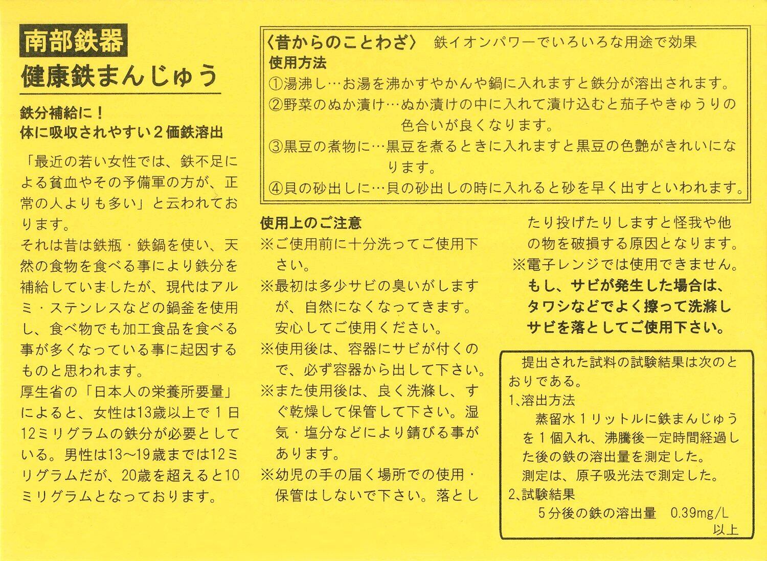 鉄分補給に…体に吸収されやすい二価鉄を溶出。鉄イオンパワーでいろいろな用途で効果。1 湯沸し…お湯を沸かすやかんや鍋に入れることで鉄分が溶出2 ぬか漬け…ぬか漬けの中に入れて漬け込むとナスやキュウリの色合いが良くなります。3 黒豆の煮物…黒豆を煮る時に入れて煮込むと黒豆の色艶が綺麗になります4 貝の砂出し…貝の砂出しの時に入れると、砂を早く出します。使用後は塩分や水分の作用で錆びやすいので、お湯で洗って水分を拭き取って頂くことを繰り返してご使用ください。