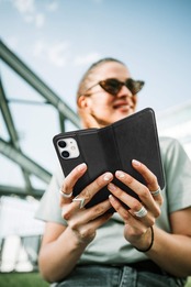 【持ち心地よい】高品質の合皮を採用して、見た目も肌触りもいいです。横置きスタンド機能も付き、長時間の動画視聴でも手に持つ必要がなく、楽に動画視聴できます!