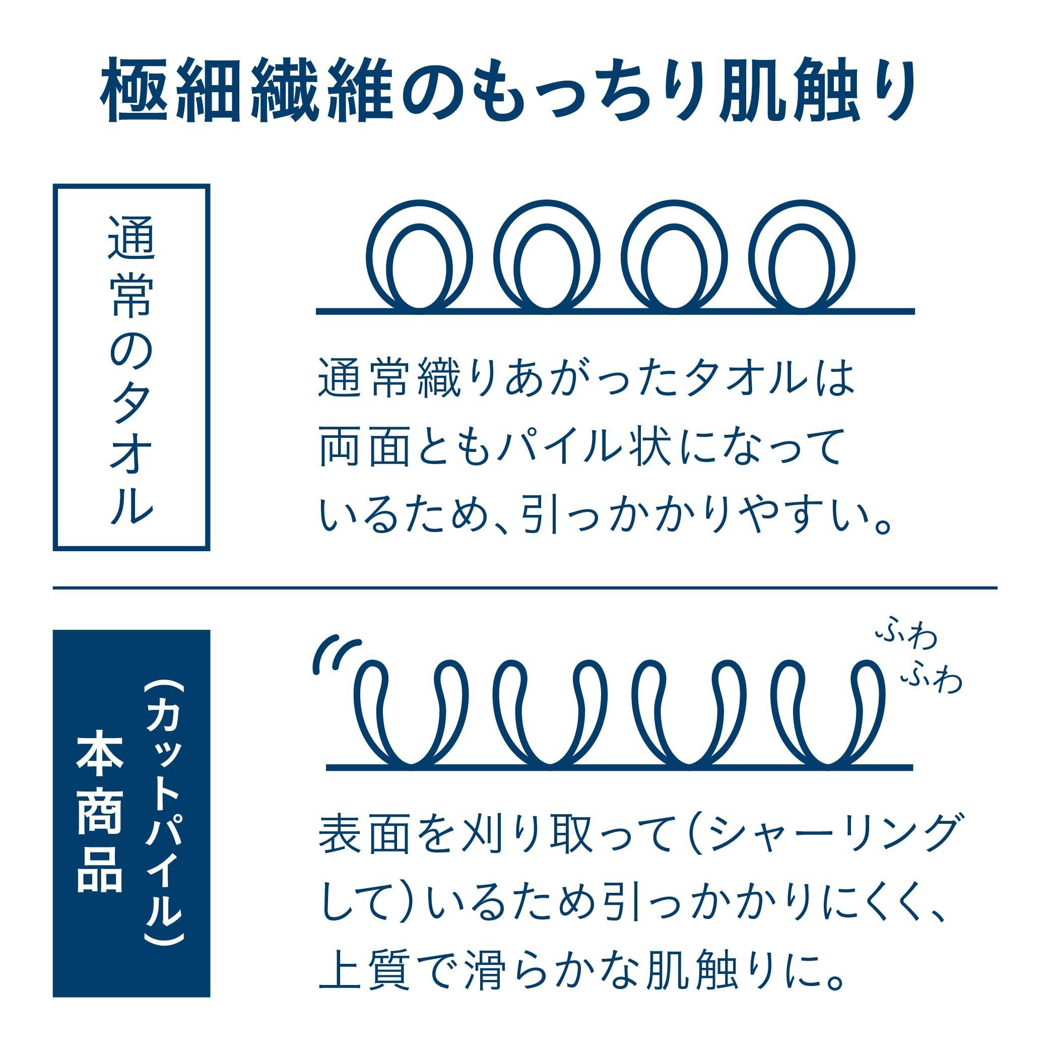 【もっちり肌触り】通常織りあがったタオルは両面ともパイル状になっているため、引っかかりやすい。表面を刈り取っているため引っかかりにくく、上質で滑らかな肌触りに。