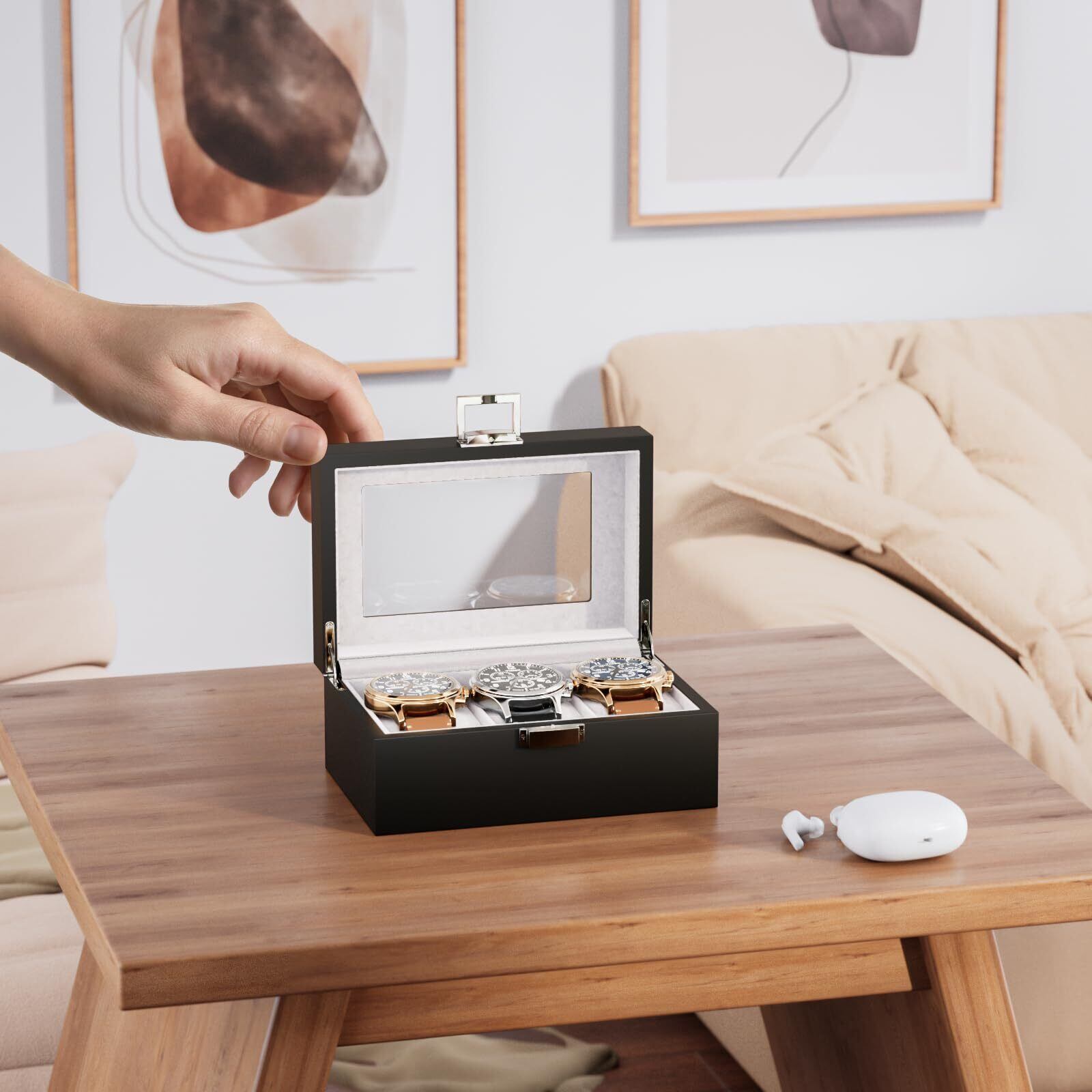 ProCase 腕時計ケース(3本用) 木製 高級な時計収納 男性 アクセサリー 収納ボックス ガラス蓋 時計用 ディスプレイケース 贈り物 プレゼント-ブラック