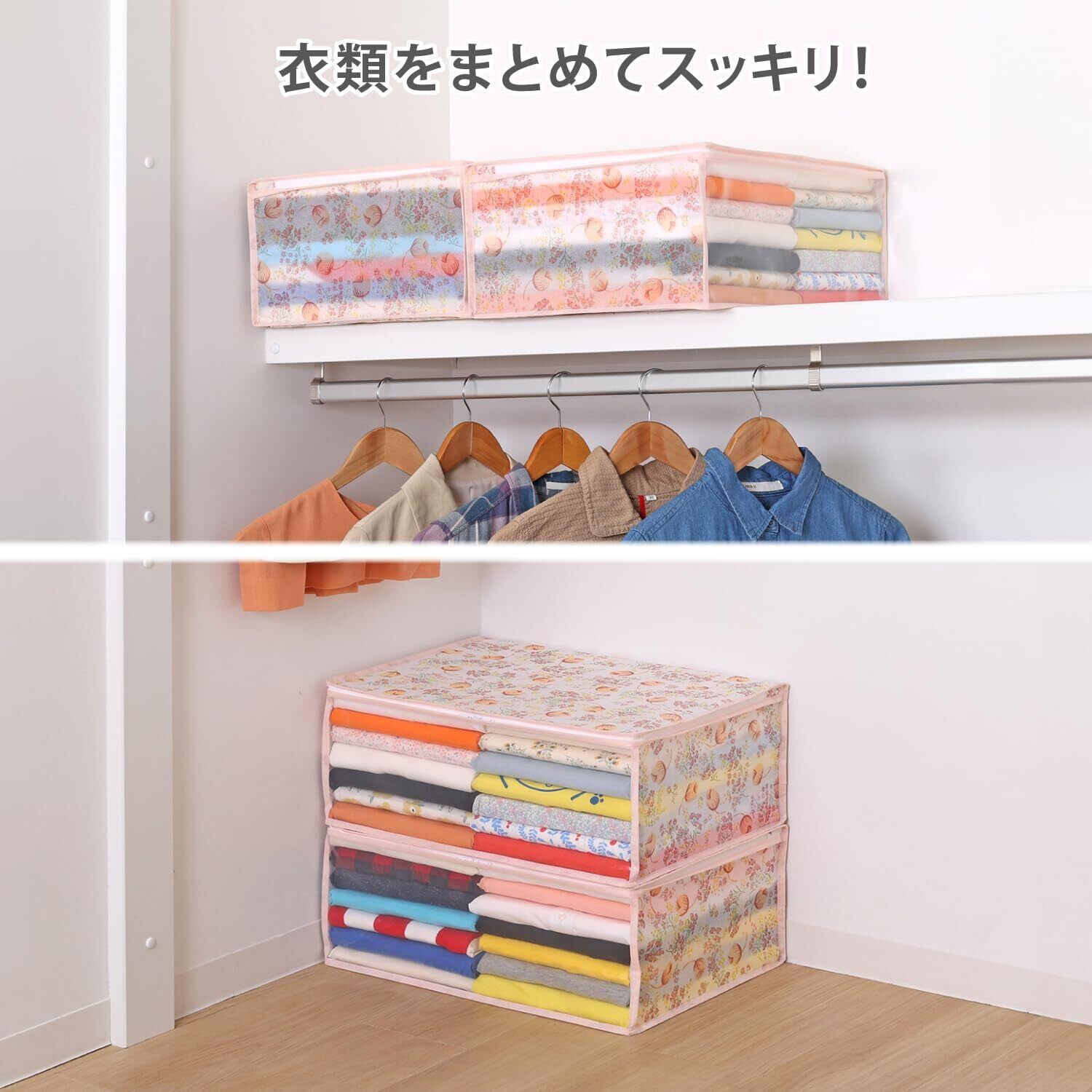 【通気性に優れた衣類収納ケース】:通気性が良くにおいがこもりにくい不織布製の衣類収納ケース。オフシーズンの衣類や予備のタオルなどをホコリや汚れなどから守り保管。