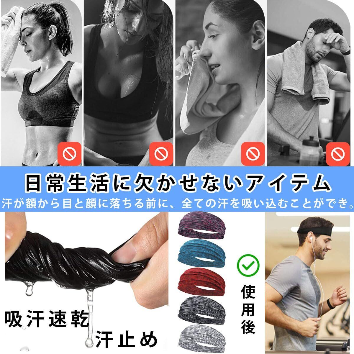 ヘアバンド メンズ ヘッドバンド スポーツ【汗止め・吸汗速乾】抗菌防臭 通気性あり 伸縮性あり 肌触り柔らかい 薄手 幅広 洗顔用 運動用 ランニング ダンス ヨガ サッカー テニス 野球 メンズ レディース オールシーズン【5枚セット】