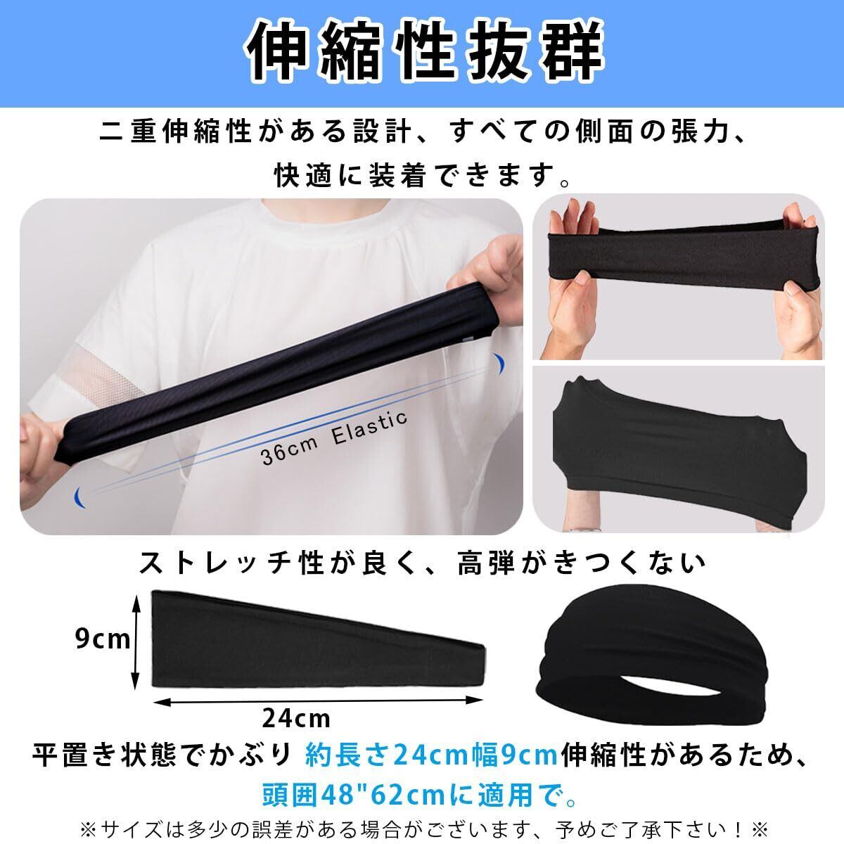 【伸縮性あり】素材は伸縮性が高く、頭囲62以上の方でも強すぎる締め付け感を感じることなく着用していただけます。適度な伸縮性なので、締め付け感や圧迫感がない、完璧的にあなたの頭をフィットしています、ダンスやランニングなど激しい運動でもずれたりなど全然しません!