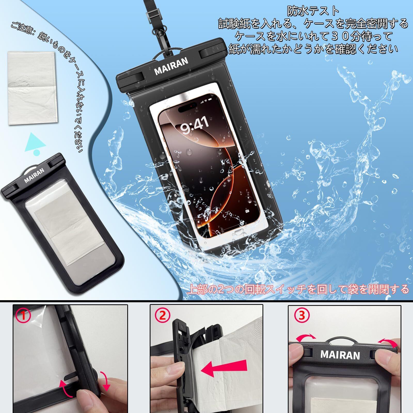 MAIRAN 2枚セット スマホ防水ケース 水中撮影 IPX8認証 熱圧技術防水スマホケース水中・水上で操作できる 良いタッチ感度 ダブルフック・安定性UP 高透過率 7インチ以下全機種対応 携帯カバー ストラップ付き 首掛け お風呂 温泉 潜水 水泳 雪 釣り プール海上アスレチックパークなど適用 iPhone/AQUOS/ARROWS/Pixel/Xperia/Galaxyに対応