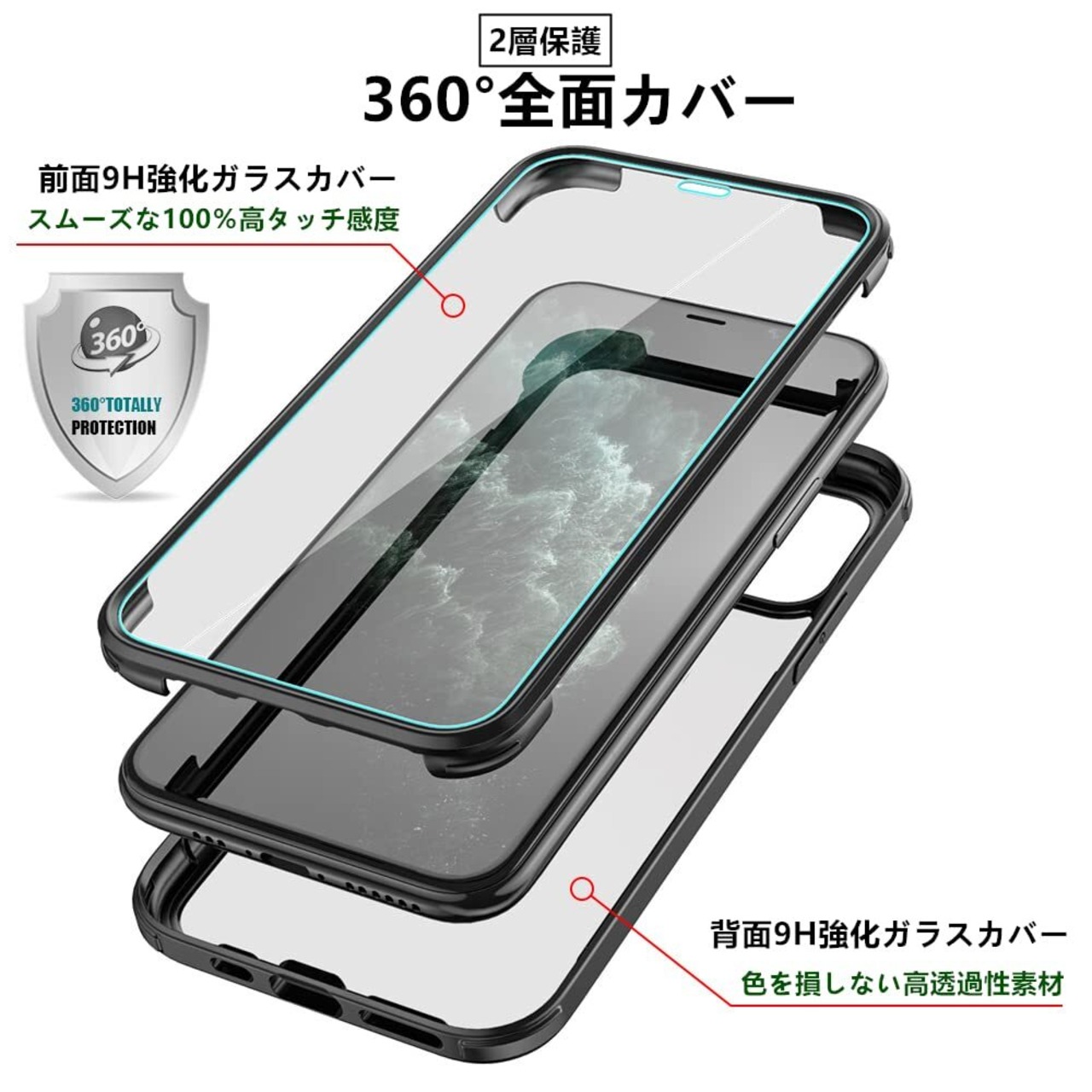 【100%画面感度】表面9H強化ガラスは、高透過率、適切に液晶画面を保護します。画面上の操作も違和感なくスムーズに行え、スムーズなタッチ操作体験をお楽しみいただけます。表面、裹面とも、二重構造の透明強化ガラス素材を使用されています。iPhoneの自然な外観を維持する元のデザインも綺麗に見られます。(ご注意:他のスクリーン保護フィルムと同時に使用しないでください。)