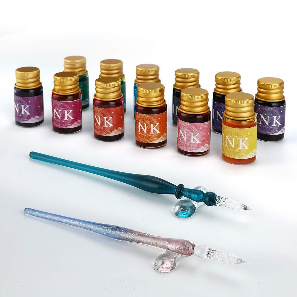 Mancola ペン2*本体 インクガラスディップペンインクセットレインボークリスタルガラスペン、アート、ライティング、署名、書道、装飾用の12種類のインクMA-JP-16