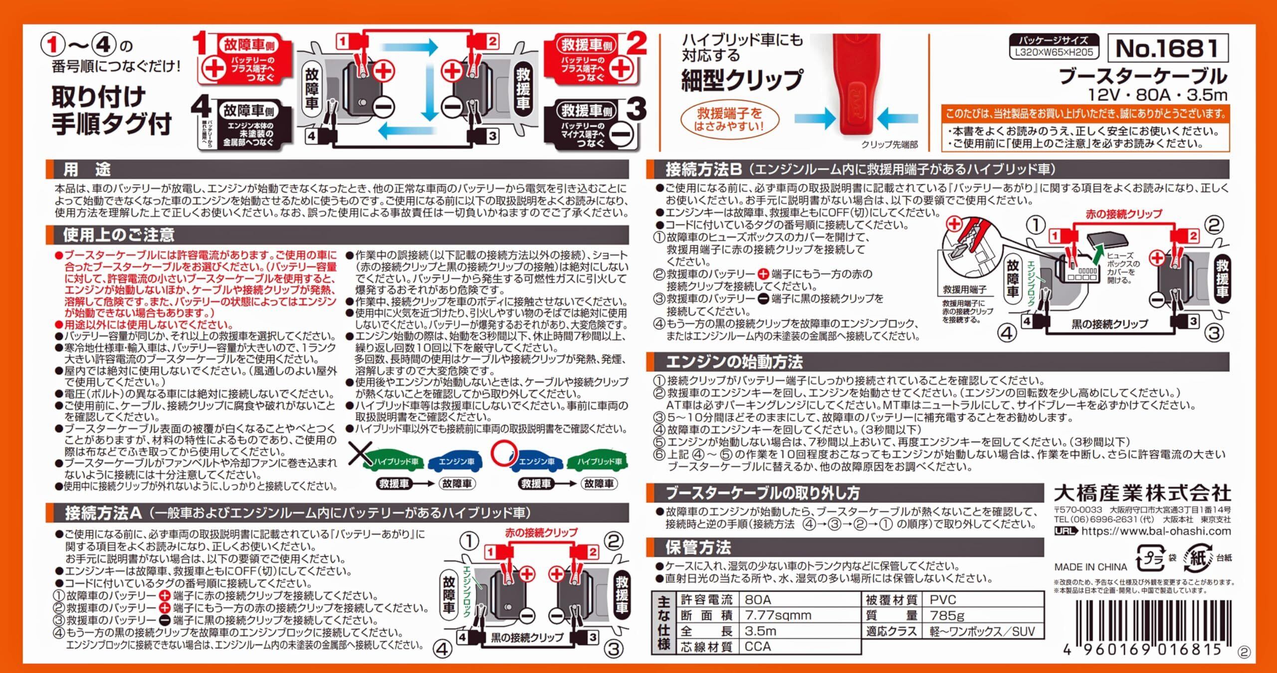 BAL(大橋産業) ブースターケーブル 12V・80A・3.5m 品番:1681
