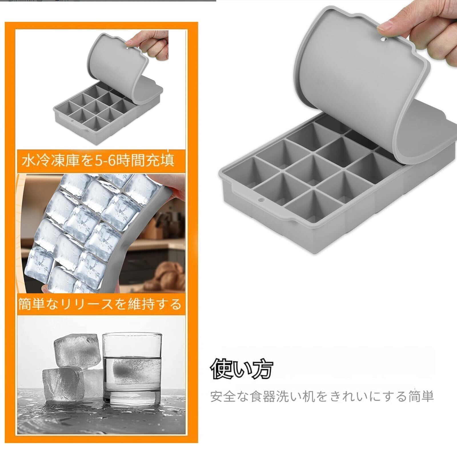 【蓋付き大型アイスキューブトレイ】この 製氷皿 シリコン には15つのコンパートメントがあり、各アイスキューブは3.5cmで、形状は正方形です; カクテル、ウィスキー、テキーラ、ウォッカ、その他の希釈度の低い飲み物を冷やすのに最適です。