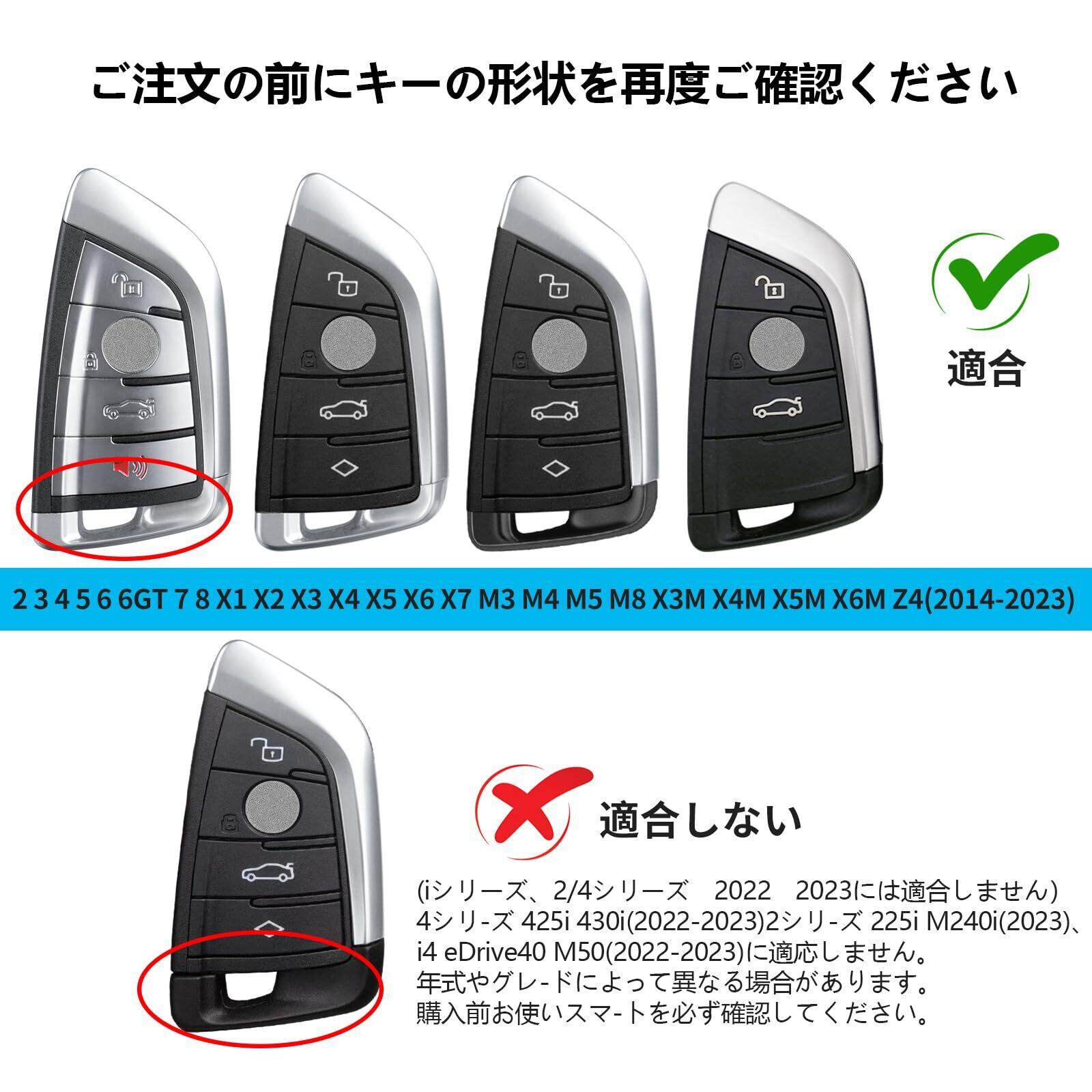 【適合モデル】BMWに適用する キーケース 2(2014-2023) 3(2019-2024) 4(2021-2022) 5(2018-2022) 6 6GT(2018-2022) 7(2016-2021) 8(2018-2022)シリーズと互換性があります、 X1(2016) X2(2018-2019) X3(2022-2024) X4(2019-2024) X5(2014-2022) X6(2015-2023) X7(2019-2022) M3(2021-2024) M4(2021-2025) M5(2018-2024) M8(2019-2024) X3M(2019-2022) X4M(2019-2024) X5M(2015-2022) X6M(2015-2023) iX3(2023) Z4(2019-2023) となります。ご注文前にキーの形状を再度ご確認ください。