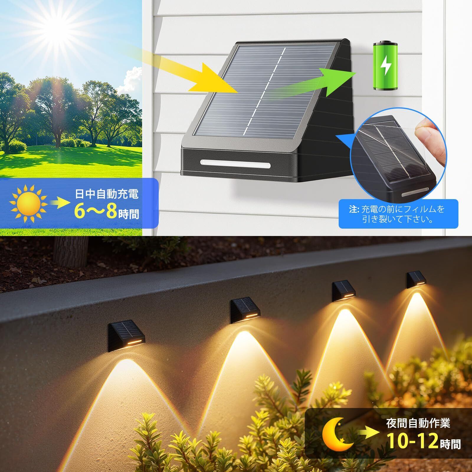【高効率ソーラーパネル&大容量バッテリー&全自動点灯/充電システム】本ソーラーライトは最新型単結晶シリコンソーラーパネルを搭載(多結晶比でコスト+50%・使用寿命+2年)。25%の高変換効率(多結晶は15%未満)を実現し、600mAh大容量バッテリーを内蔵。日中6-8時間の充電で、明暗センサー作動により夜間10-12時間自動点灯。完全ワイヤレス設計でメンテナンス不要です