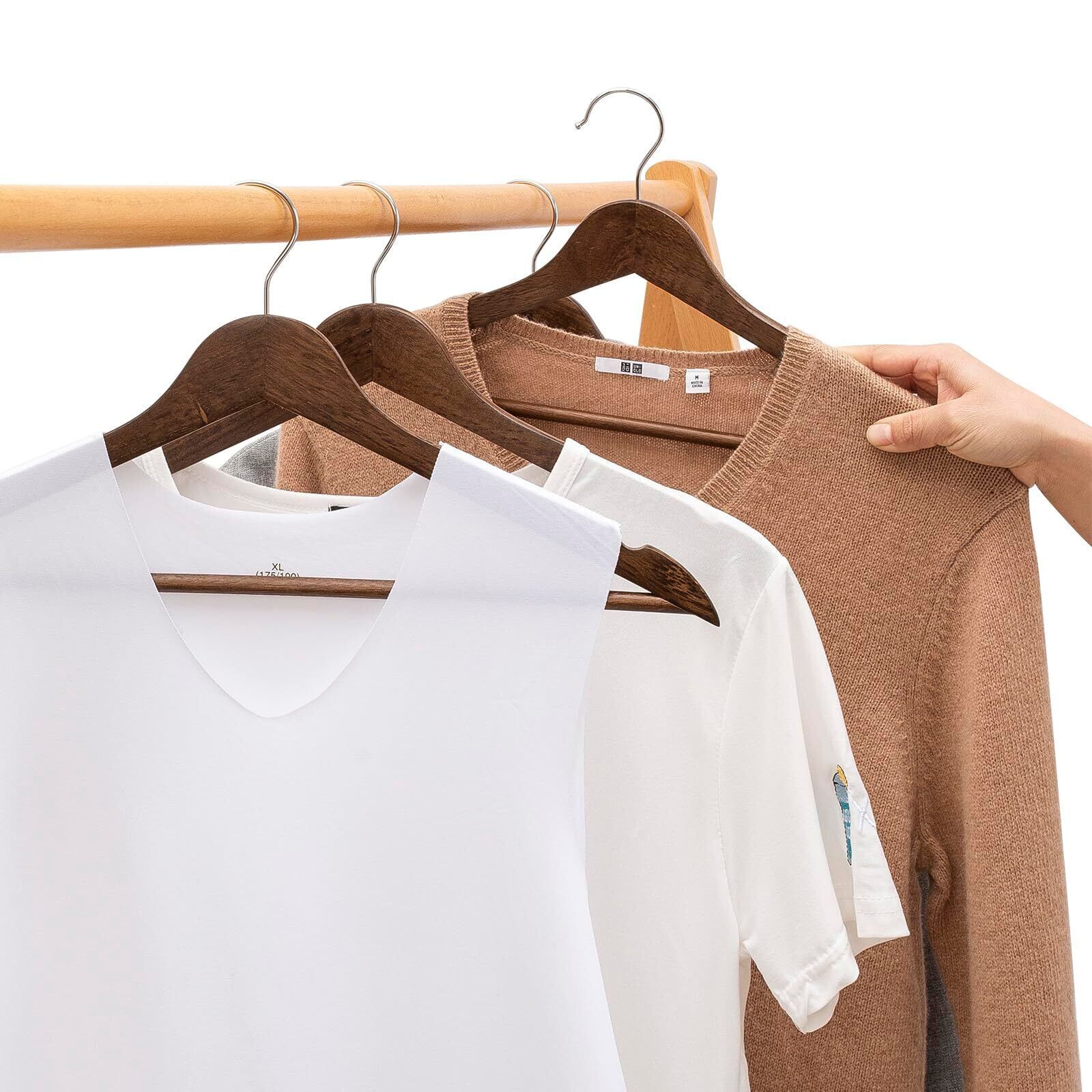 【高級褐色の木製ハンガー】良質な木材を使用し、頑丈で耐久性も抜群です。絶妙な木目調の洋服ハンガー 木製、環境にやさしい耐摩耗性ワニスによる塗装、クローゼットにクルミの木のハンガーを掛けるといい味です。
