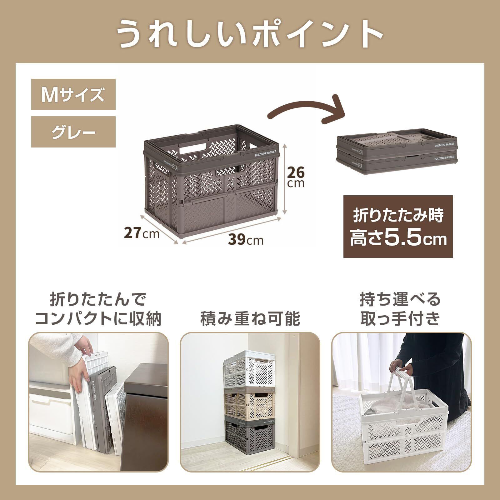 天馬(Tenma) 折りたたんでコンパクトになる持ち手付きの収納ボックス 完成品 折りたたみバスケット Mサイズ お部屋に馴染むデザインの折り畳みコンテナ オリコン カゴ A4ファイルがぴったりのバスケット プラスチック 【組立不要】 【色 グレー】 【サイズ M】 【幅39×奥行27×高さ26cm】【折りたたみ時 高さ5.5cm】