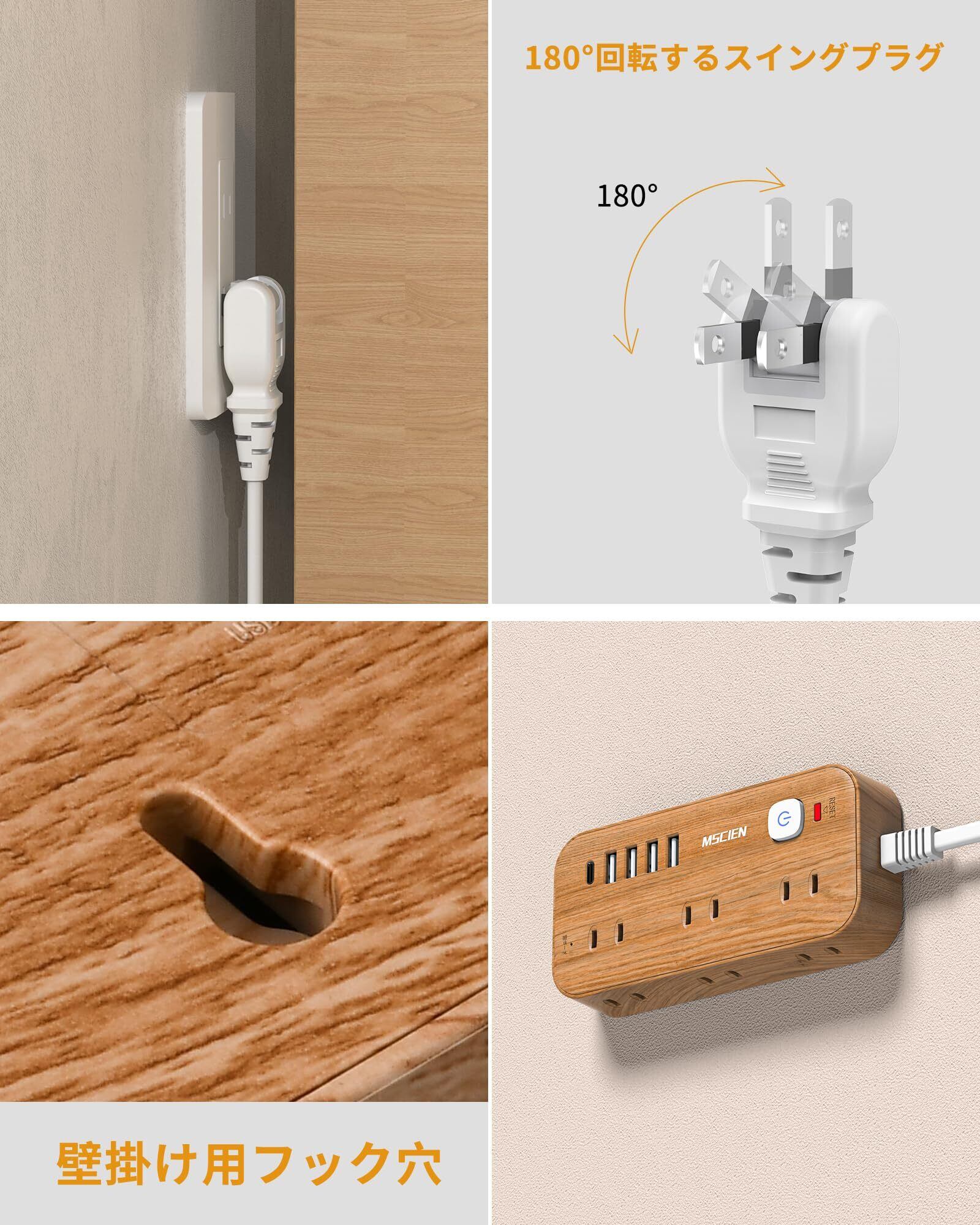 エムサインMscien 延長コード 2m 電源タップ usb コンセントタップ たこあしコンセント テーブルタップ タコ足配線 電源コード 6個AC口 4個USB-A 1個USB-C 延長 コード 電源タップ スイッチ付き 雷ガード 横差し マルチタップ 電源 タップ コンセント 分岐 oaタップ 延長ケーブル 延長コード おしゃれ 木目 オシャレ コンパクト スリム 壁掛け/卓上に (2M)