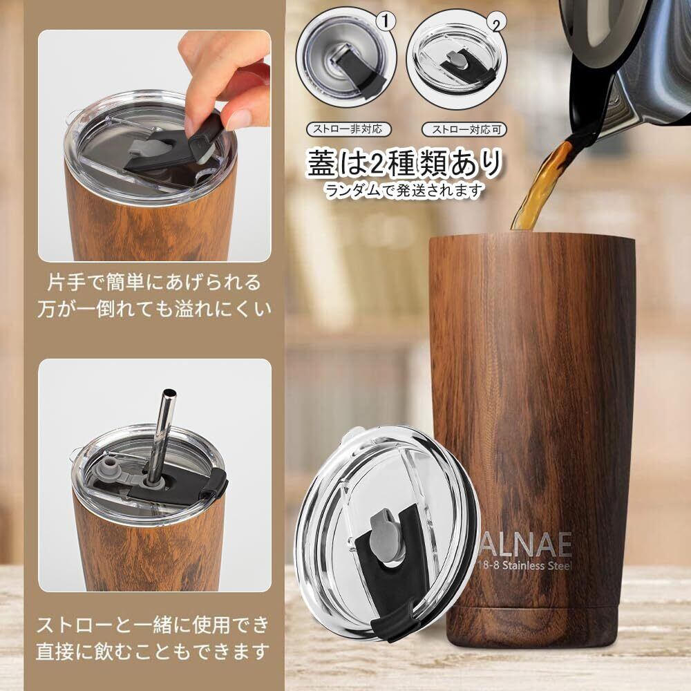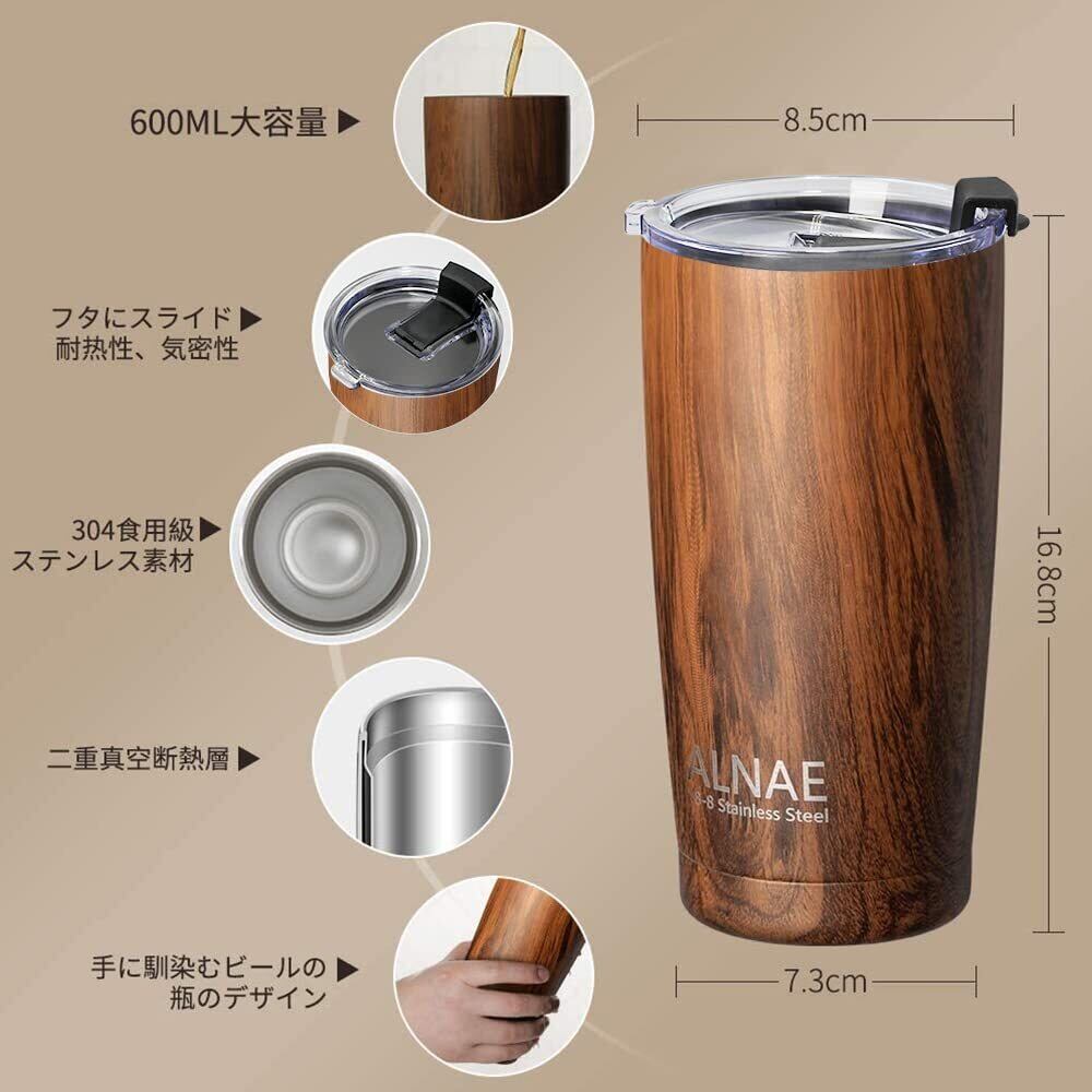 ALNAE タンブラー ふた付き 真空断熱 600ml 水筒 マグボトル コーヒーカップ 二重構造 保温保冷 直飲み 大容量 ビール コーヒー 直接ドリップ 木目調