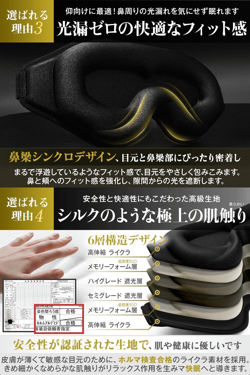 【国内認証済み·ホルムアルデヒド合格】素材の安全性は皮膚の健康を守るバリアです。皮膚が薄くて敏感な目元のために、極上のシルクのような質感を持つ高級ライクラ素材を採用。特製の6層構造により、「柔らかな肌触り」、「通気性×速乾性」、「業界最高の遮光性能」を提供し、あなたの快適な睡眠をサポートします!