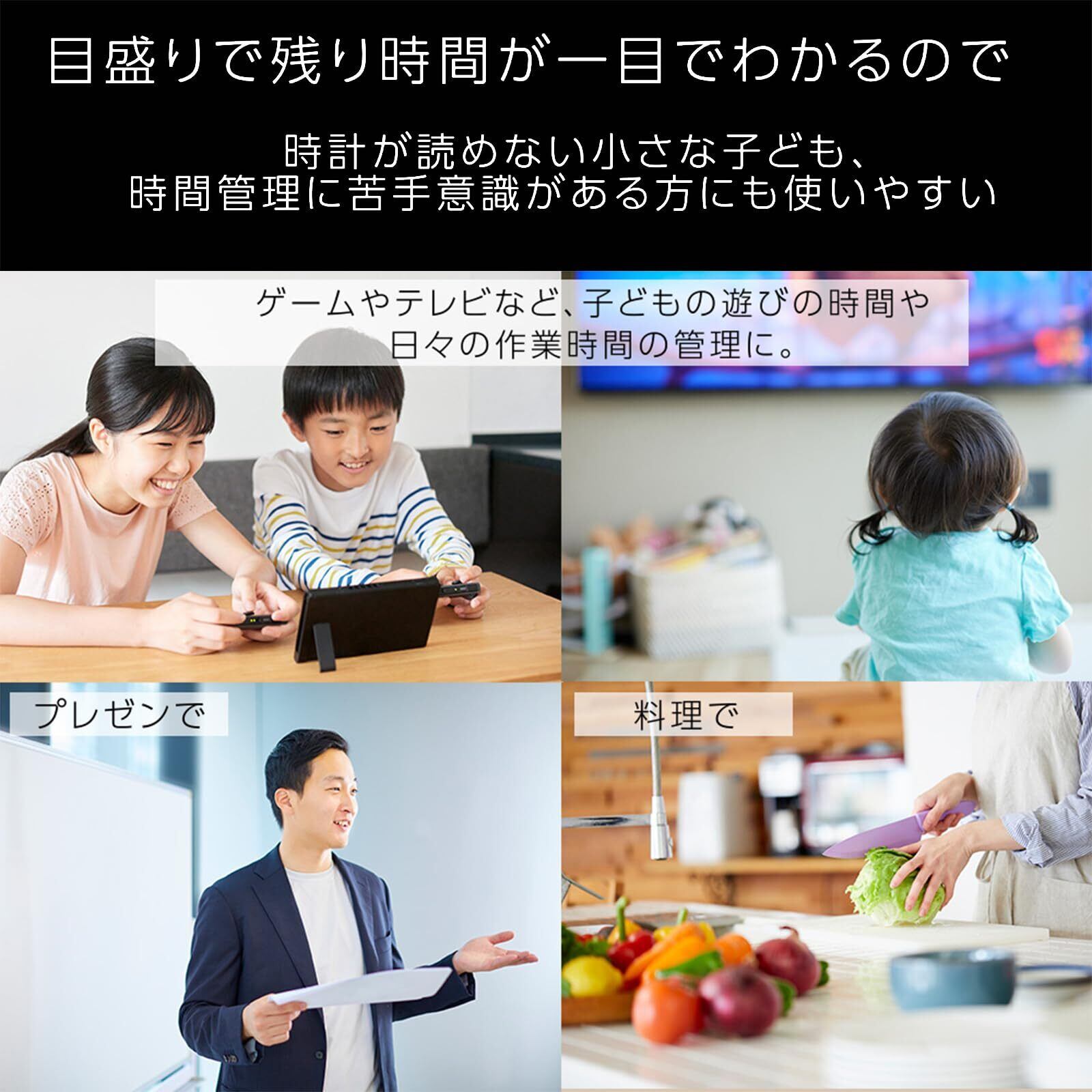 時間のカウントアップとカウントダウンの使い方ができます。カウントアップでは子どもの遊び時間の管理や日々の作業時間管理に便利です。カウントダウンではプレゼンや料理など作業しながらの時間配分を目盛りの増減を視覚的に確認することができます。
