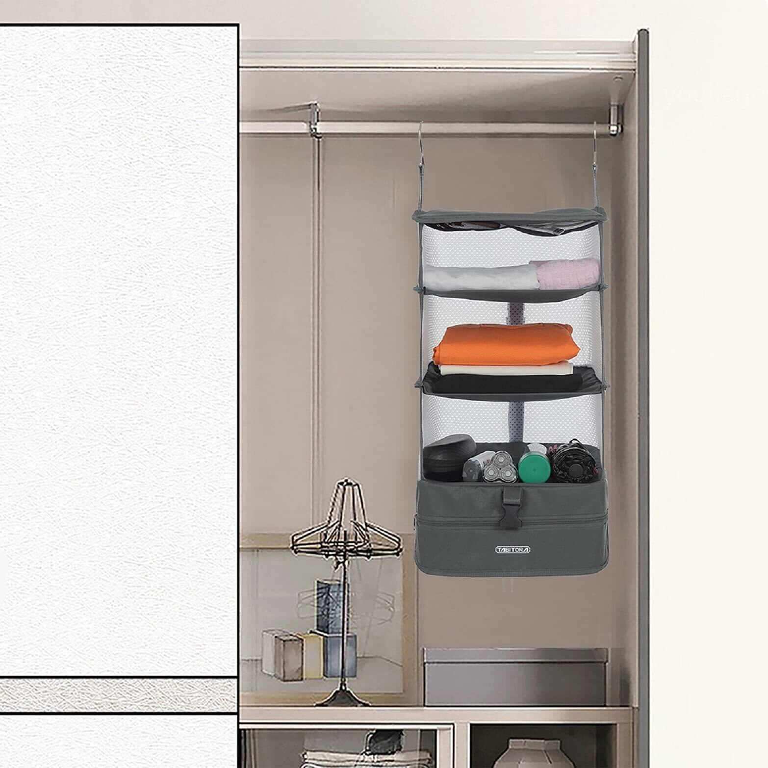 [タビトラ] クローゼット吊り下げ収納 インナーバッグ 衣類ラック 収納 旅行 出張 クローゼット 収納ボックス 吊り下げ 省スペース 大容量 衣装ケース 4段 取付簡単 折り畳み式 グレー L