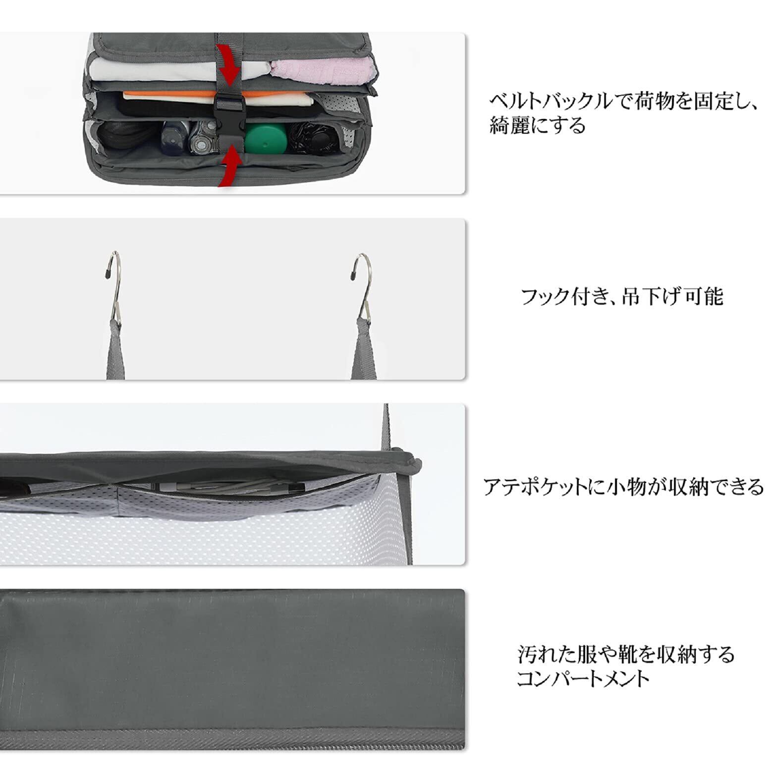 【吊下げタイプ】吊下げタイプなので、壁掛けが可能です。入ることはもちろん、取り出しも持ち運びにも便利です。通気性がいいし、中のものも一目瞭然で、時間を節約、頻繁に出張に行く身としては非常に便利です。