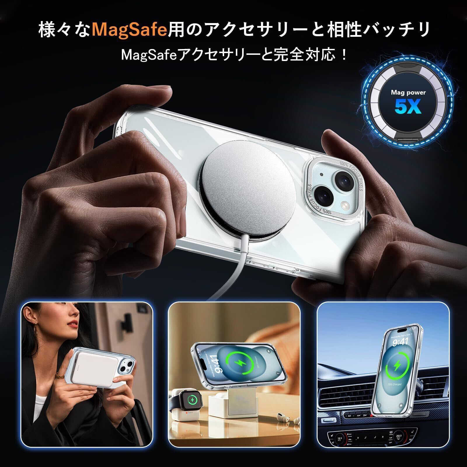 【MagSafe対応・磁力アップグレード】:強力なN52磁石を搭載しており、磁石吸着力は従来より10倍高め、ケースを装着したまま高速ワイヤレス充電が可能です、充電時の熱を周囲に発散して。Magsafe充電がかつてないほど簡単にできます!強い磁力により車運転中の激しい振動でもMagsafe車載ホルダーから外れることなく、市販のあらゆるMagsafeアクセサリーに簡単対応!いくら振っても落ちないので、充電しながらゲームをやっても問題なし!【 iphone 15 Plus 用 ケース アイフォン15Plus 用 ケース アイホン15プラス用ケース】