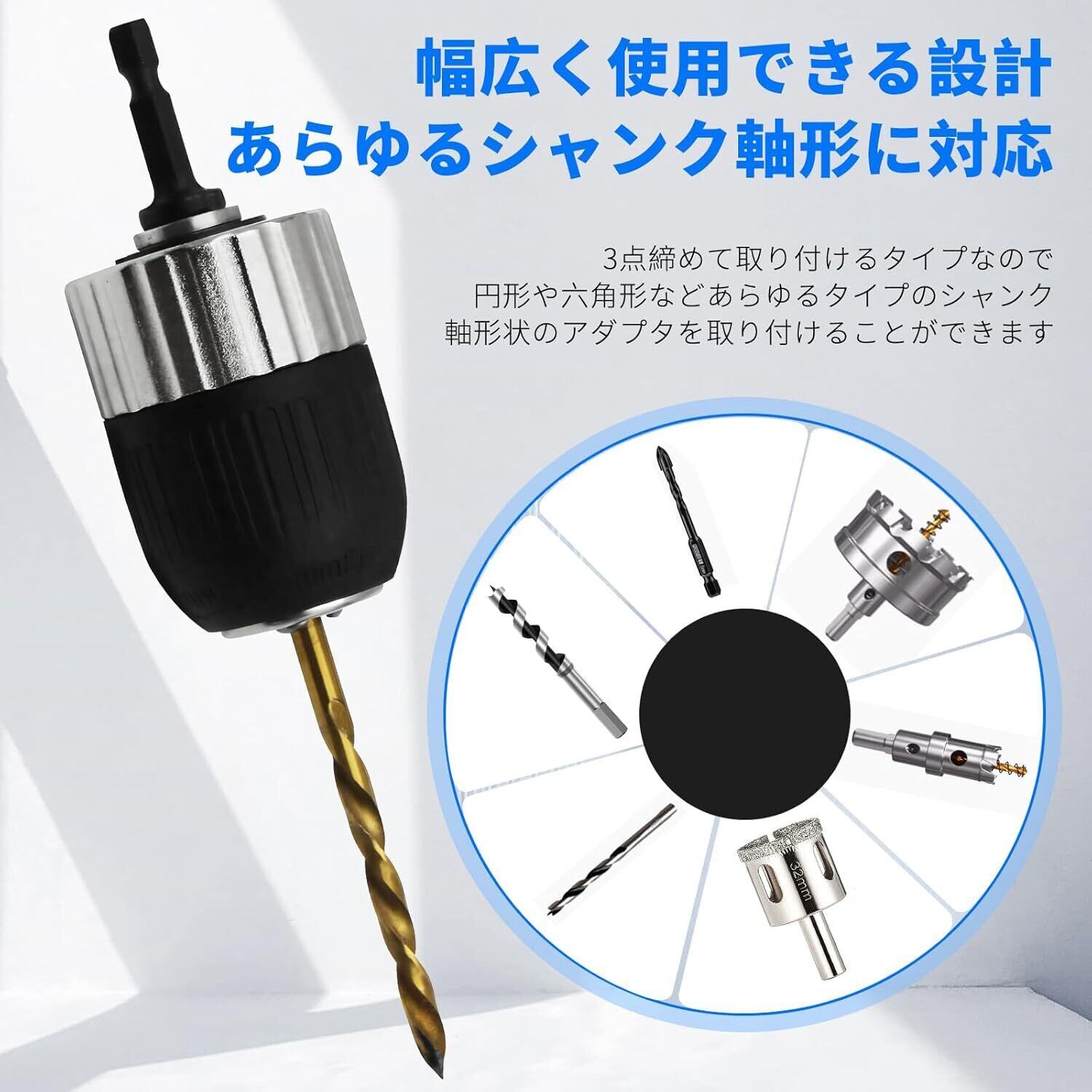 【セット内容】:キーレスチャック×1、六角シャンクアダプタ×1。