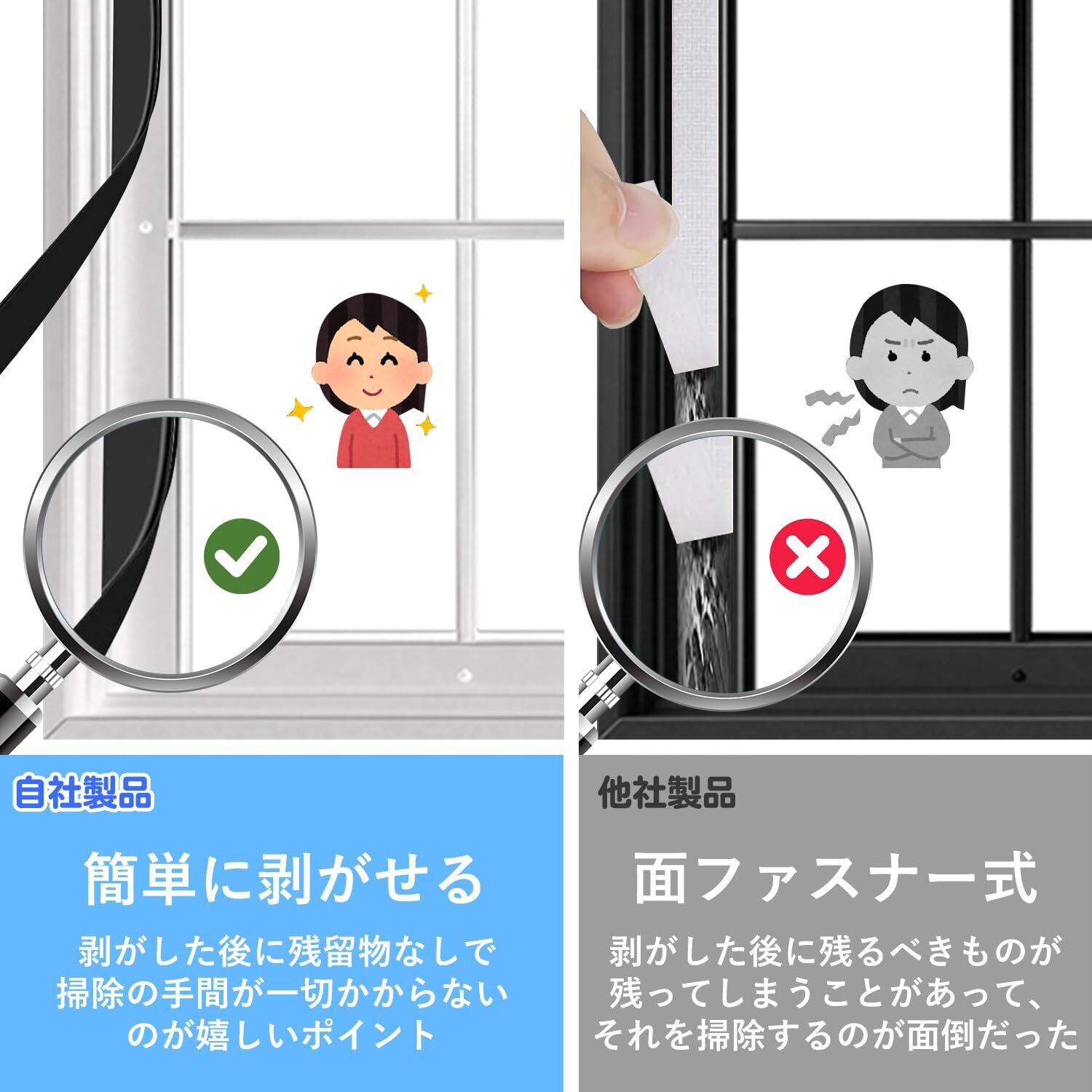 【簡単に取り外し可能】マグネット式なので、取り付けだけでなく取り外しも非常に簡単です。掃除をする際や使用しない時はすぐに外すことができ、粘着テープの痕が残りにくく、キレイに剥がせます。もし痕が気になる場合は、施工前にマスキングテープを窓枠に貼っておくとさらに安心です。
