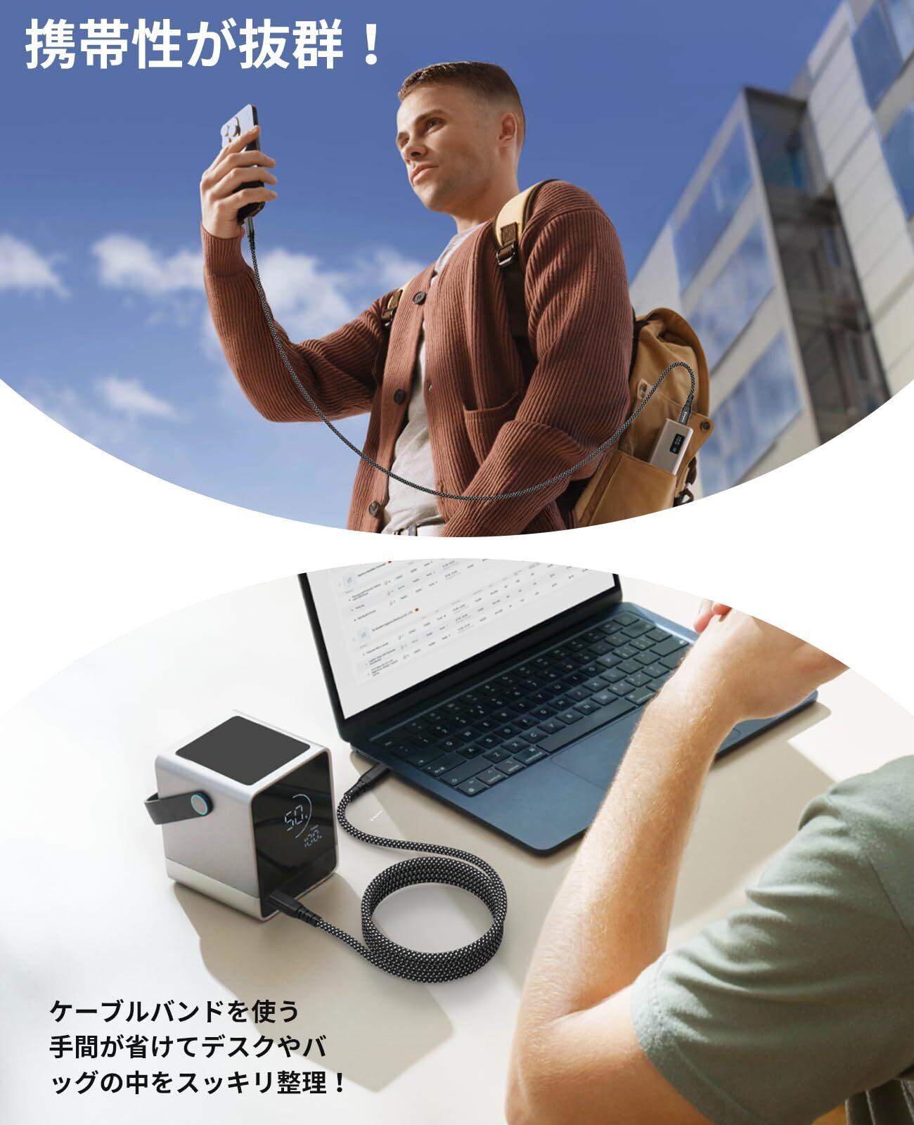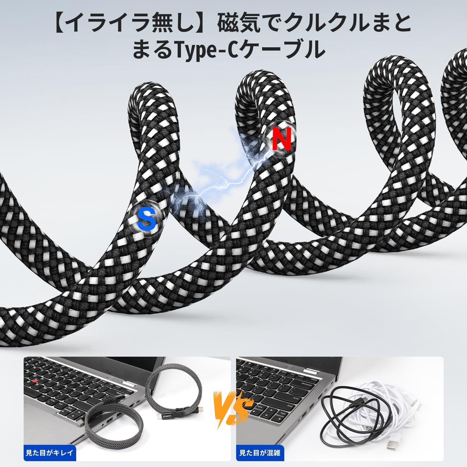 【形状記憶保持機能、特許取得済】本Cタイプケーブルは独自の形状記憶加工により、ケーブル全体が留め具を要らず自然にまとまる仕様を採用!充電中も使わない時もかさばらずに収納可能!この独自技術は特許取得済で、国内外のサスティナビリティ先進企業も認めた。