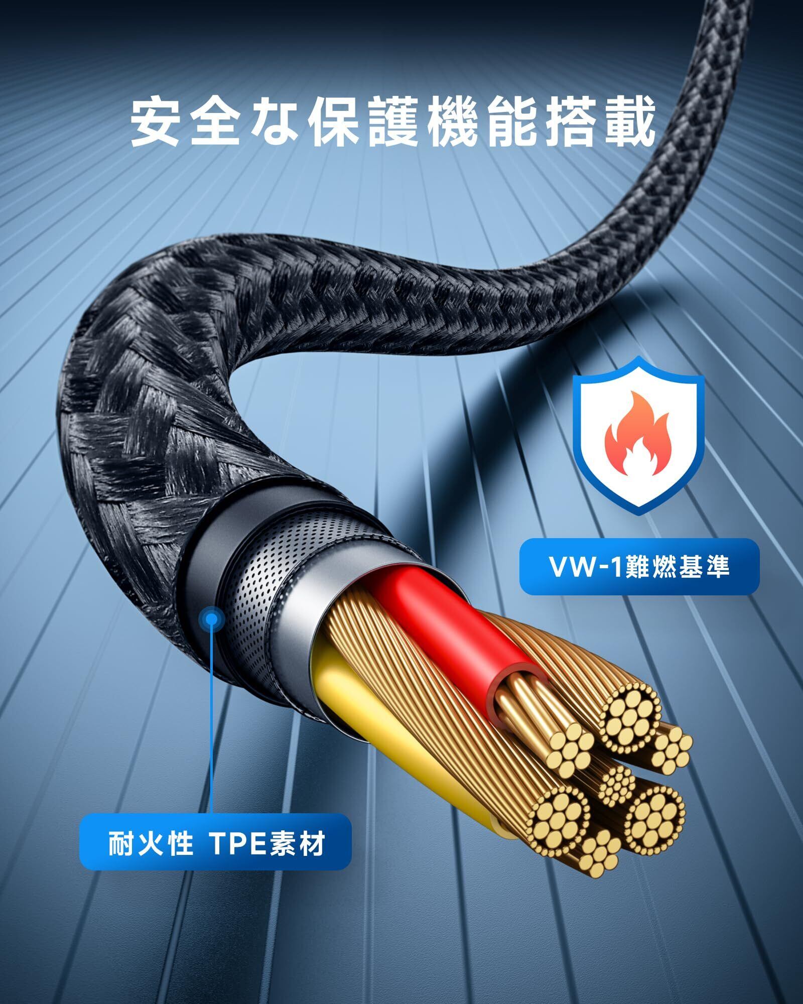 【認証された安全性】この Type-C ケーブル は56kΩレジスタの実装によりデバイスを短絡、過充電、過熱などから高安全保護します。サビなどに強く信号劣化を抑える金メッキピンと難燃性の素材を採用し、安全性を高めています。過充電、発熱と短絡を防止する機能を搭載し、安定性の高い急速充電と大切な機器の損傷防止を実現します。