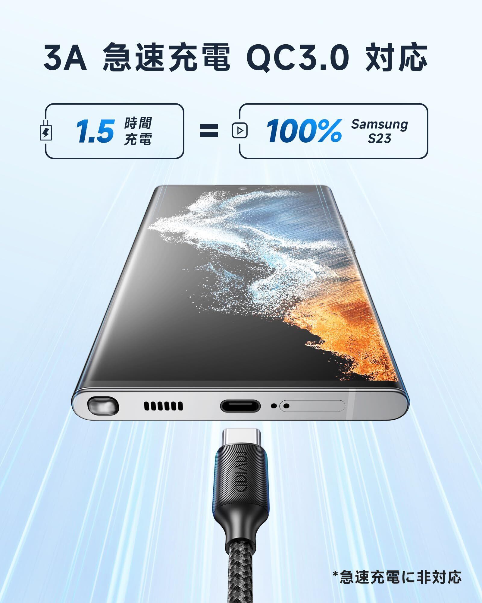 【QC3.0急速充電・データ転送】USB C ケーブルは時間を節約し、最大5V/3Aの最大充電速度をするように設計されています。お使いのスマートフォンやタブレットなどのデバイスを短時間でフル充電し、貴重な時間を節約できます。急いでいる時でも便利で利用できます。USB2.0基準、最大480Mbpsのデータ転送速度です、1GBのファイルを数秒間で転送完了します。(注意: 当製品は SuperCharge、DASH Charge、 Moto TurboPower Technology 充電に適していません。)