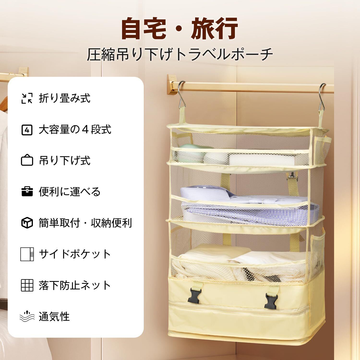 【数量限定】VARNIC 吊り下げ収納 トラベルポーチ 落下防止ネット付き クローゼット 旅行 出張 ポータブル 吊り下げ収納ケース 衣類ラック 収納 大容量 4段 省スペース 折り畳み式 取付簡単 トラベル 吊り下げ 通気性 防臭 (ベージュ, Large) | allstore3