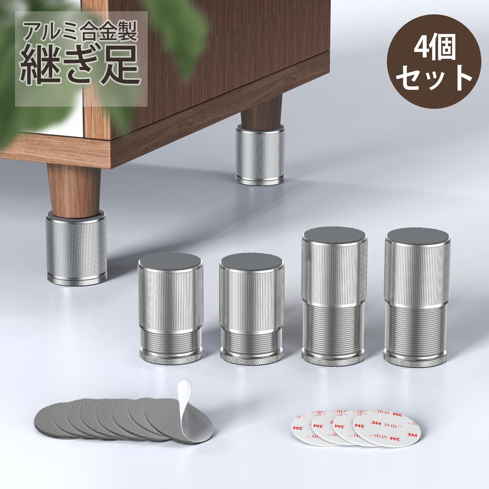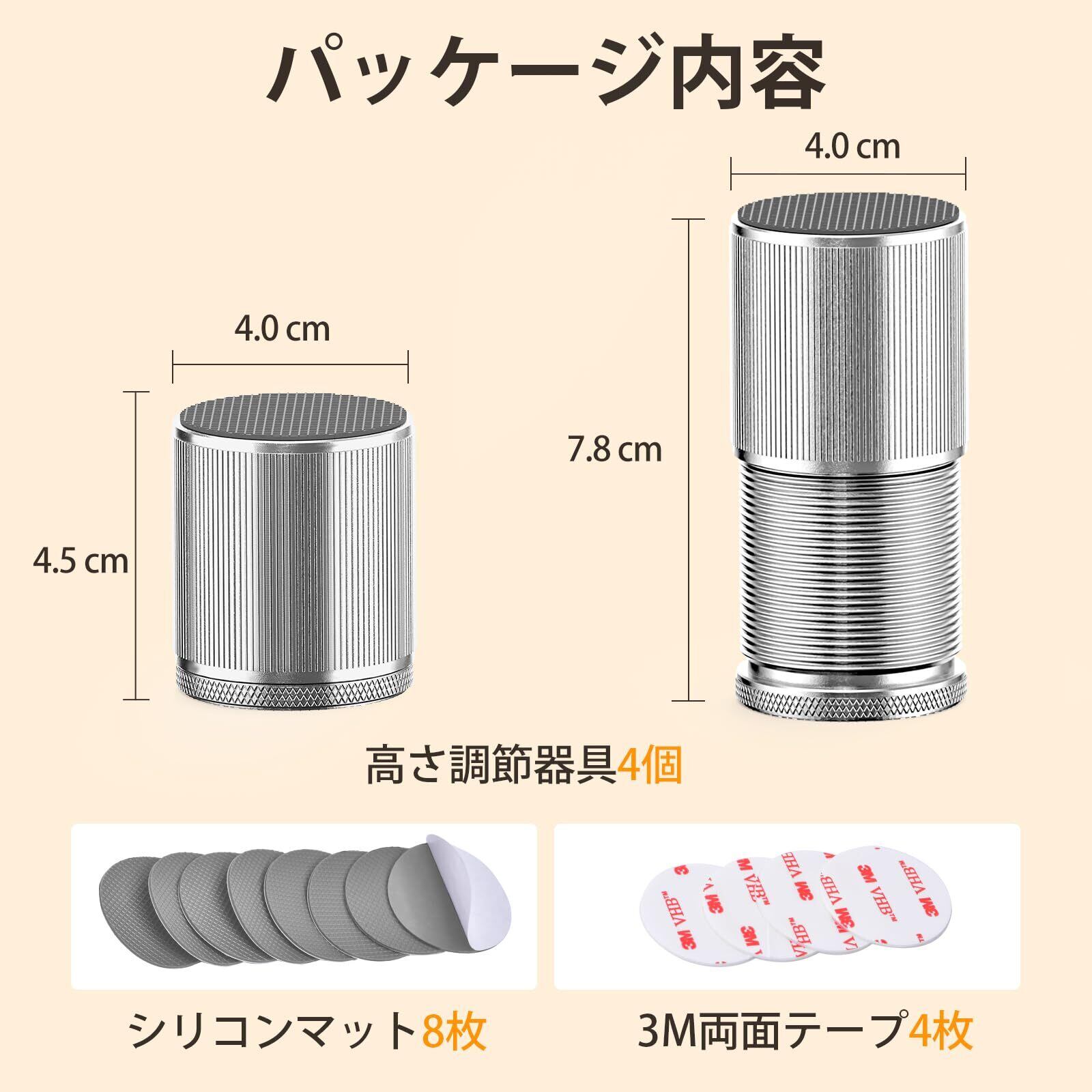 【製品仕様】サイズ:4x4×4.5cm(4個セット) 高さ調整範囲:4.5-7.8cm 材質:アルミニウム合金 色:シルバー 総重量:約280g 耐重荷:500kg 適応サイズ: 4×4cm以下の角脚、直径4cm以下の丸脚