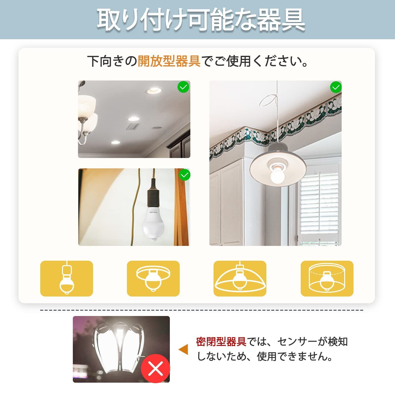 【取り付け器具についてのご注意】センサー検知障害の原因になりますので、センサー部を覆う形状の器具には使用しないでください。下向きの開放形器具でご使用ください。