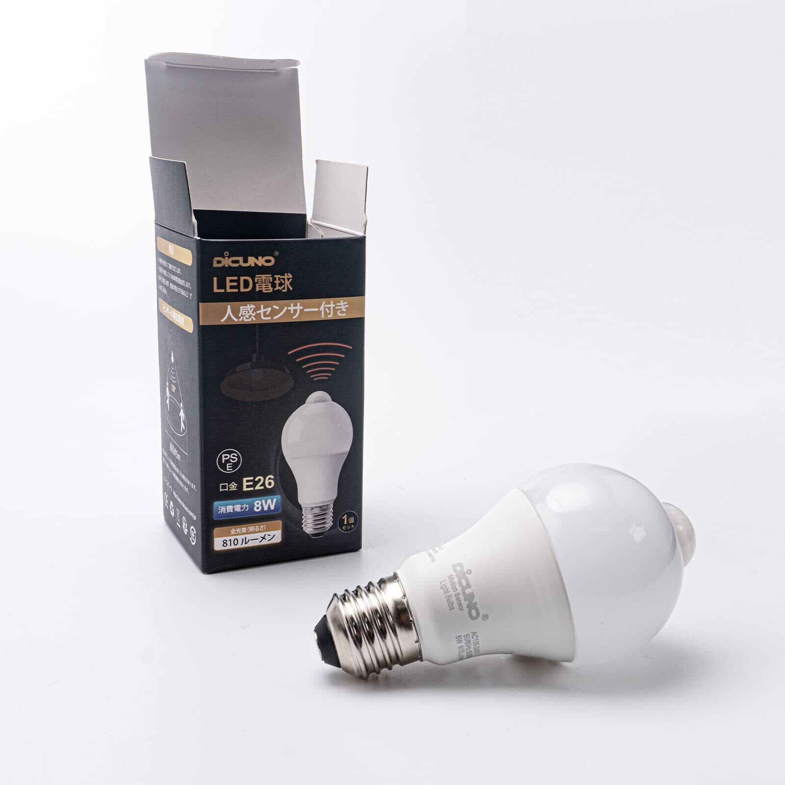 DiCUNO LED電球 E26口金 人感センサー 8W 60形相当 810lm 昼白色 5000K 明暗センサー付き 消し忘れ防止 赤外線センサー 自動点灯 高輝度 非調光 省エネ PSE認証済み 2個入